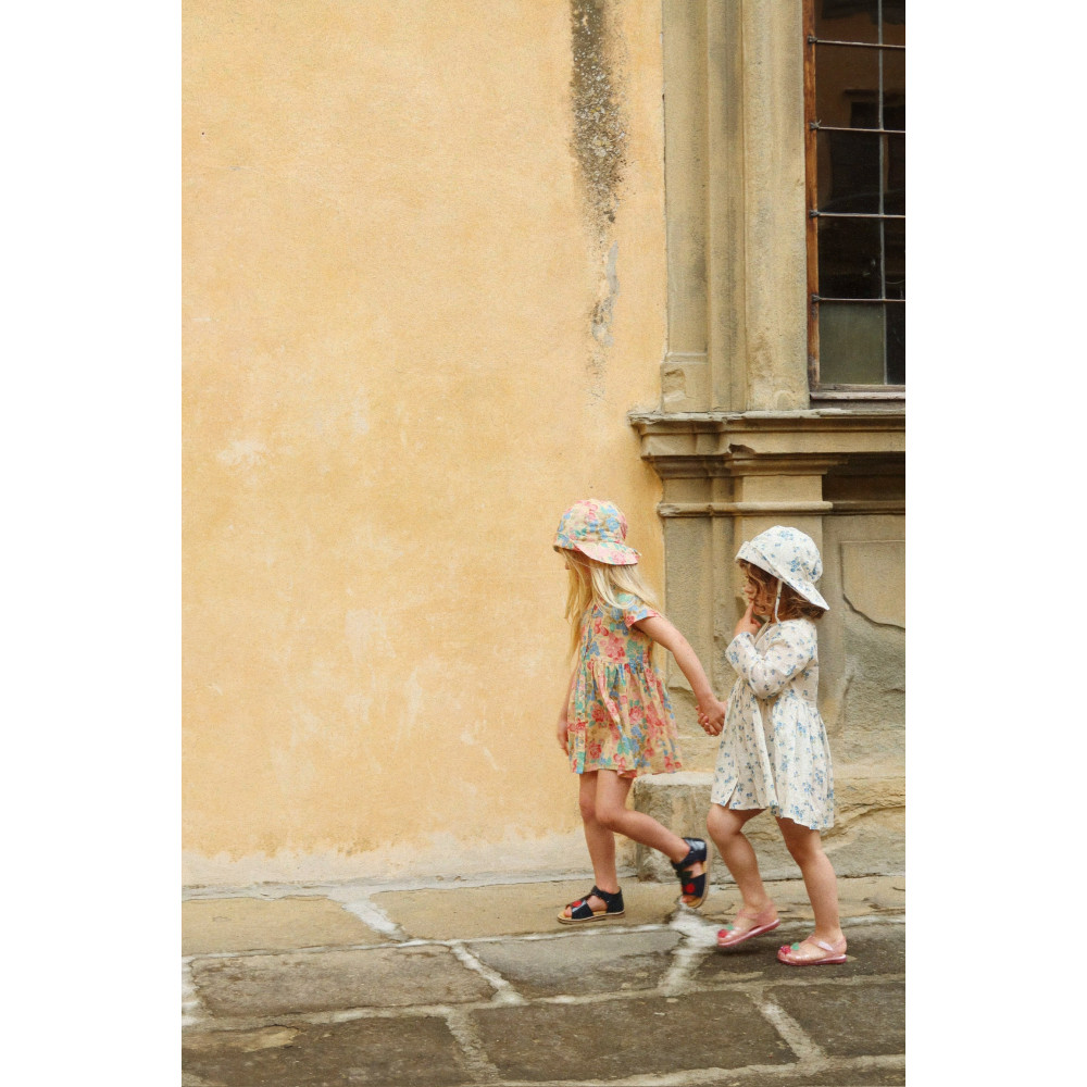 М'яка та легка літня сукня, виготовлена зі 100% органічної бавовняної вуалі. Ідеальний літній екземпляр, ця сукня має короткі рукави, розкльошену спідницю та перламутрові ґудзики спереду.