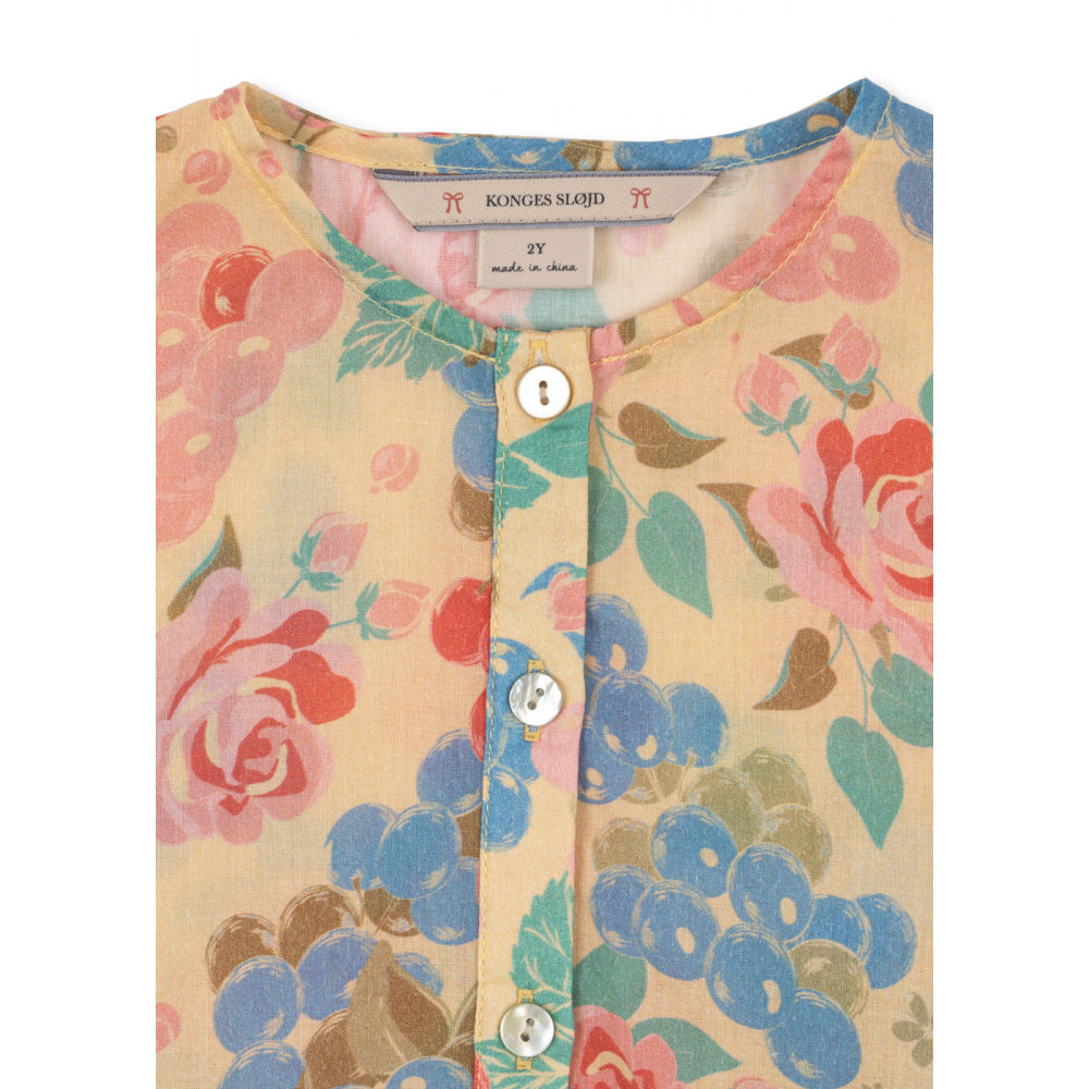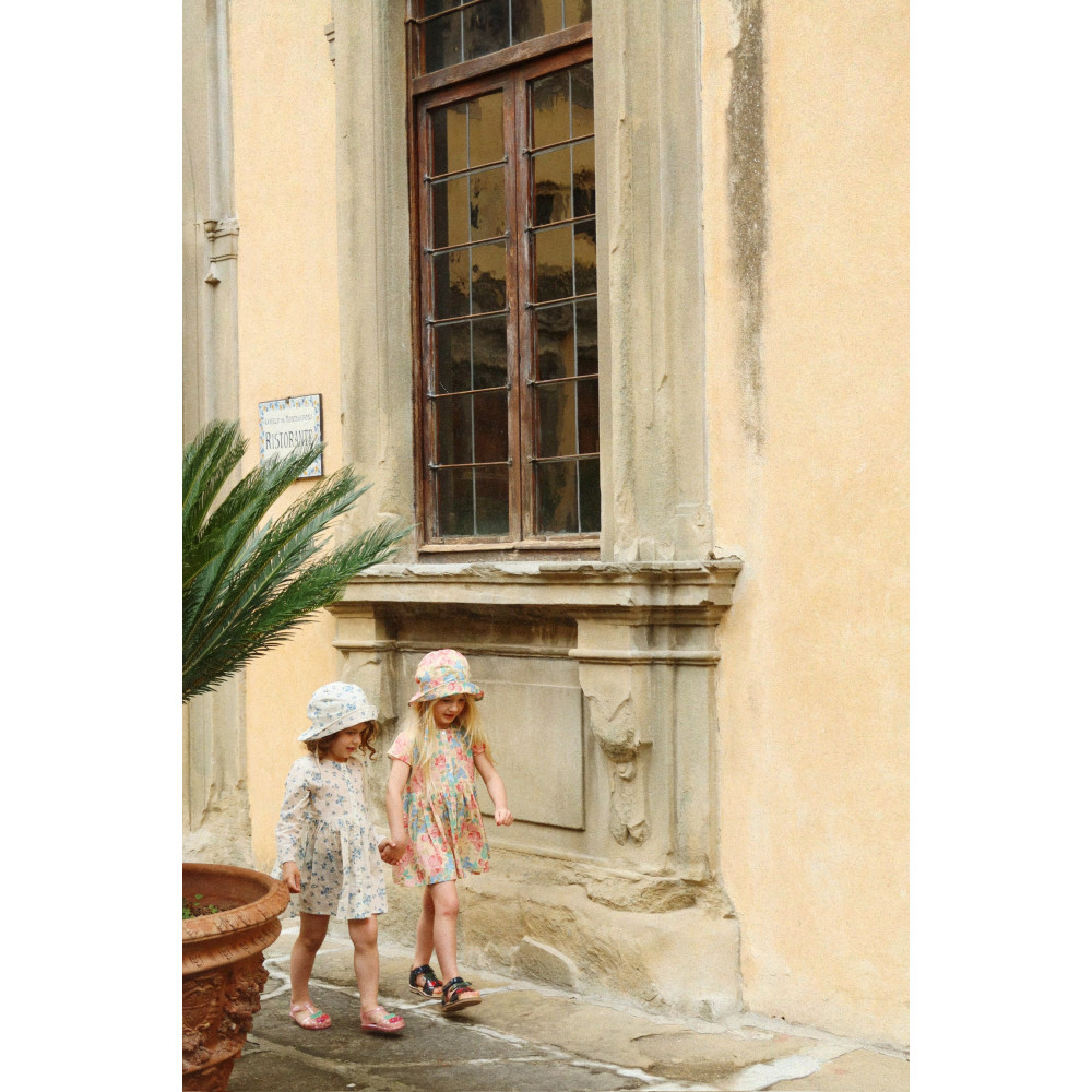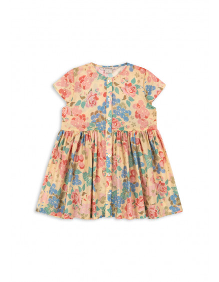 М'яка та легка літня сукня, виготовлена зі 100% органічної бавовняної вуалі. Ідеальний літній екземпляр, ця сукня має короткі рукави, розкльошену спідницю та перламутрові ґудзики спереду.
