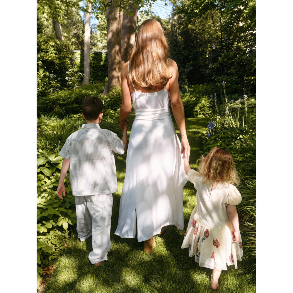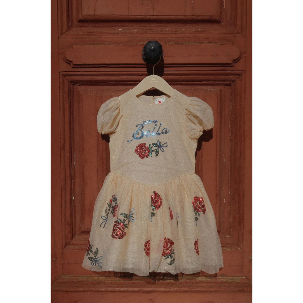 Сукня RHW x KS Bella — це виріб мрії з мерехтливих шарів тюлю. Розроблено з короткими, злегка пишними рукавами та об’ємною спідницею для чарівного ефекту сповисання. Підкладка з м'якої бавовни для комфортного носіння. Прикрашений трояндами з паєток і підписом «Ciao Bella» спереду.