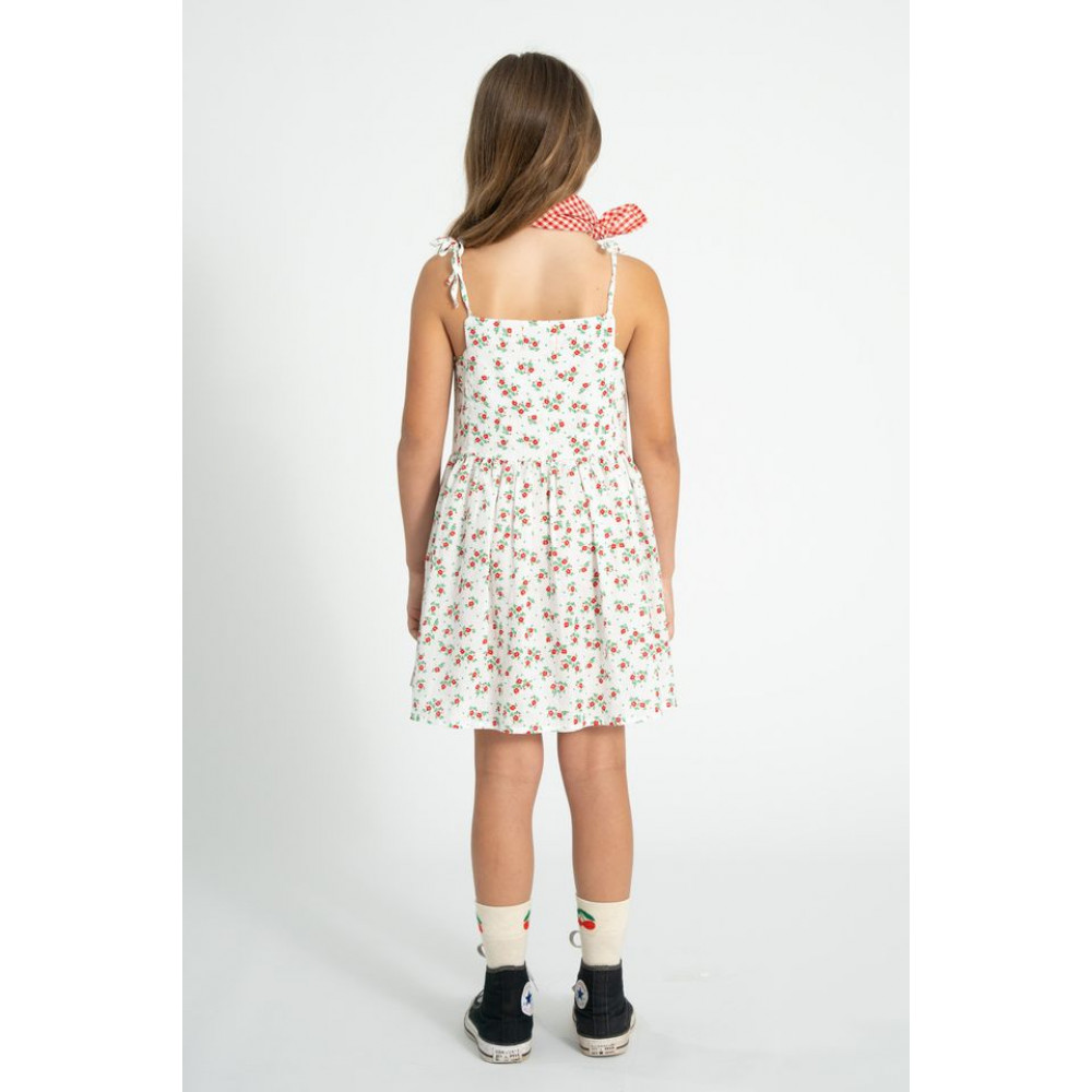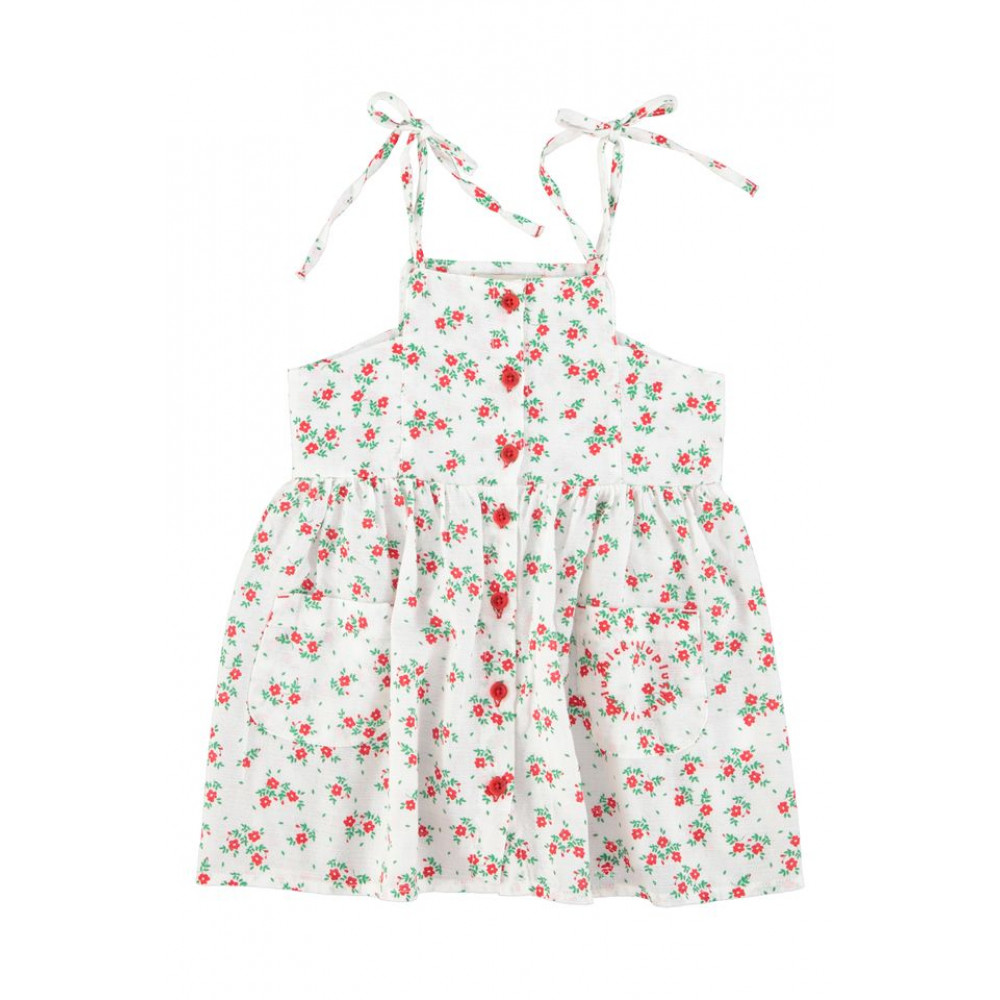Коротка сукня з тонкими бретельками на плечах та накладними кишенями, одна з яких має червоний вишитий логотип. Червоні ґудзики спереду. Прати в холодній воді (макс. 30ºC). Не відбілювати. Не сушити в сушильній машині. Прасувати в прохолодній воді (макс. 110°C). Хімчистка будь-яким розчинником, окрім трихлоретилену.