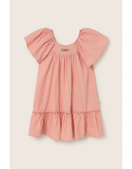 Об'ємна сукня в смужку з бавовняної тканини з текстурою, що імітує льон. Широкий еластичний комір. Вишивка на передній кокетці. Рукави-волани. Зібраний поділ з рюшами у верхній частині та обробка салатовим краєм.