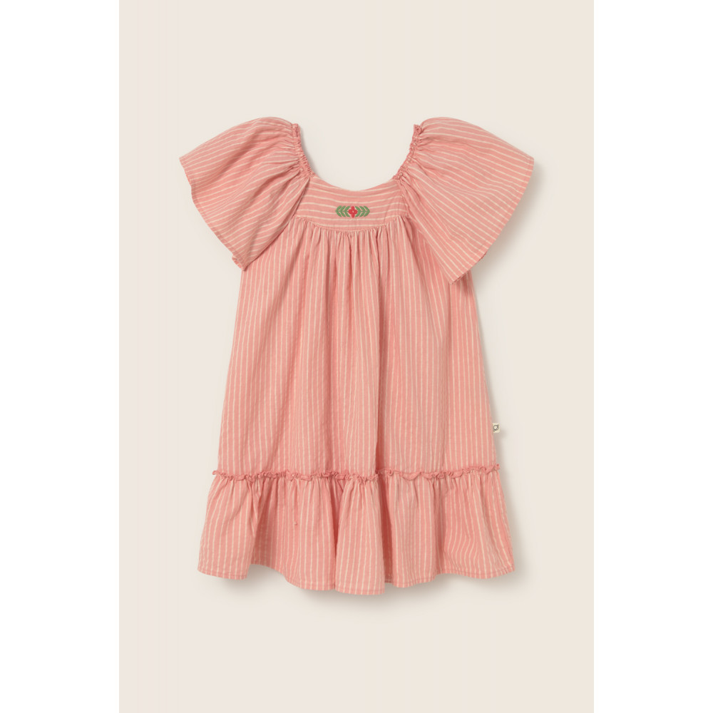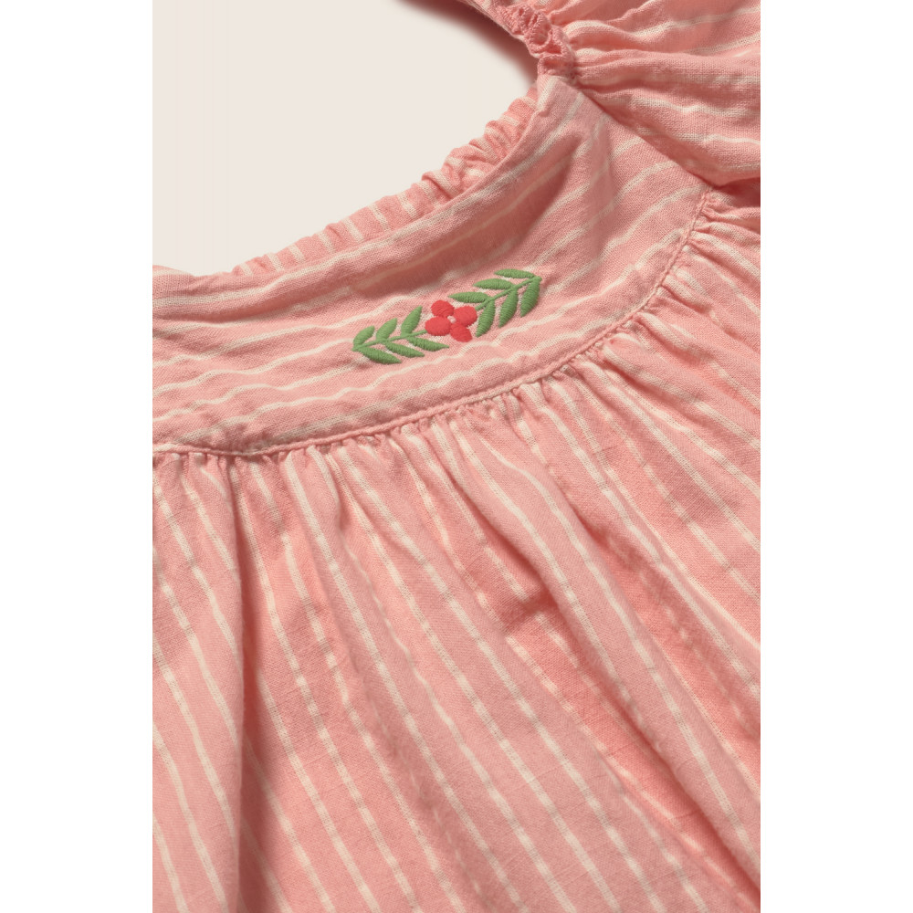Об'ємна сукня в смужку з бавовняної тканини з текстурою, що імітує льон. Широкий еластичний комір. Вишивка на передній кокетці. Рукави-волани. Зібраний поділ з рюшами у верхній частині та обробка салатовим краєм.