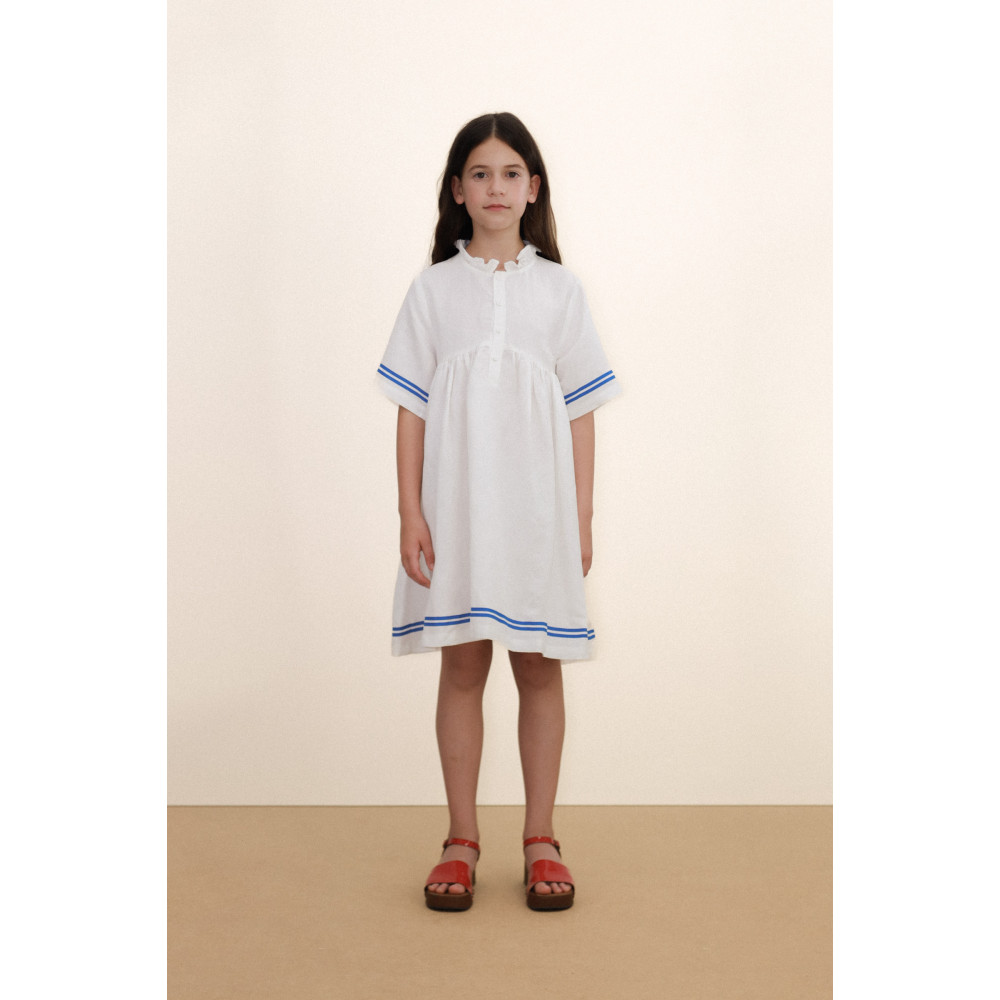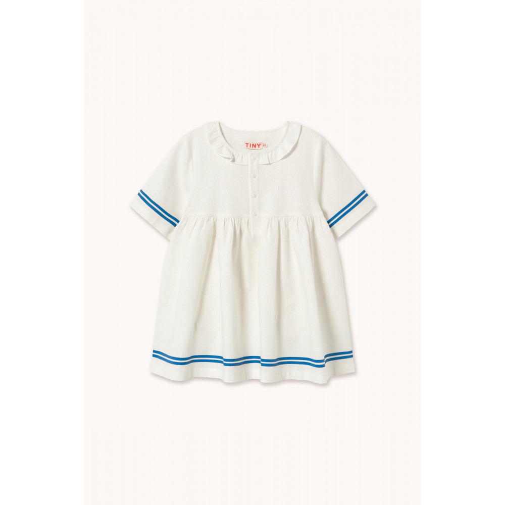 Ця смугаста принтована сукня вирізняється своїм свіжим та зручним дизайном, виготовлена з м'якої бавовняної суміші, яка пропускає повітря. Вона має круглий виріз горловини з каймою та ніжним воланом, а також напіврозріз спереду на ґудзиках, що полегшує одягання та додає шарму. Завдяки легкій драпіровці та продуманим деталям, це ідеальний вибір для теплих сонячних днів. Універсальна, зручна та природно стильна сукня, ідеально підходить для будь-якої події.