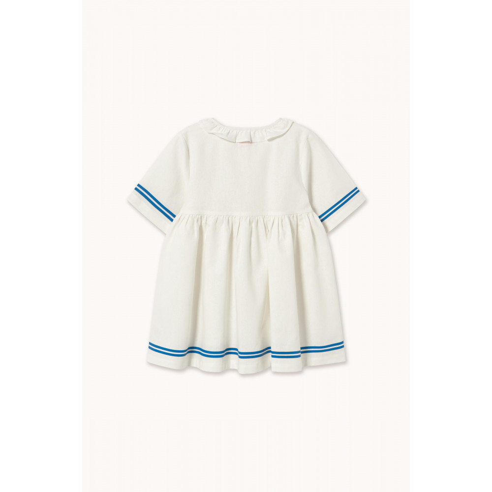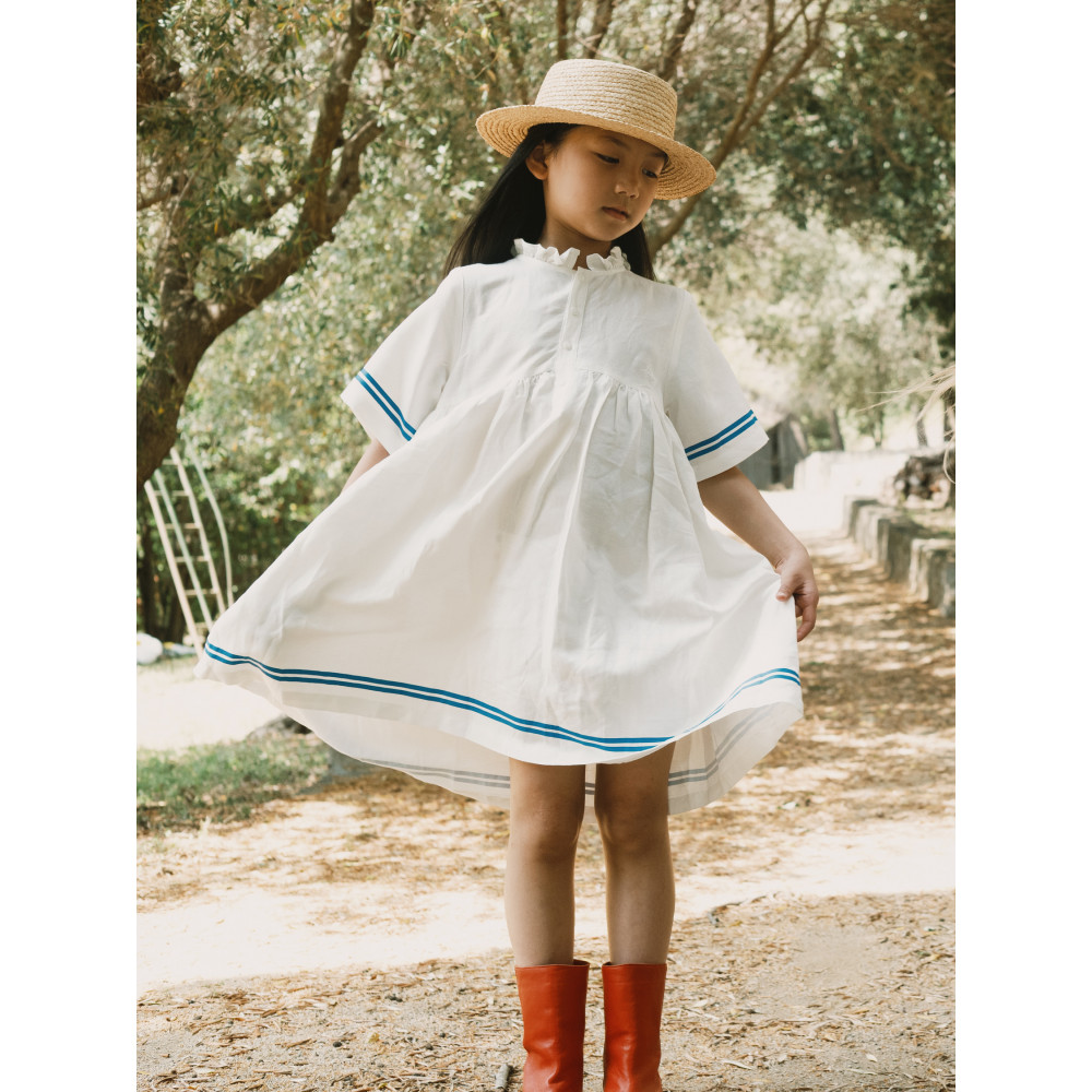 Ця смугаста принтована сукня вирізняється своїм свіжим та зручним дизайном, виготовлена з м'якої бавовняної суміші, яка пропускає повітря. Вона має круглий виріз горловини з каймою та ніжним воланом, а також напіврозріз спереду на ґудзиках, що полегшує одягання та додає шарму. Завдяки легкій драпіровці та продуманим деталям, це ідеальний вибір для теплих сонячних днів. Універсальна, зручна та природно стильна сукня, ідеально підходить для будь-якої події.