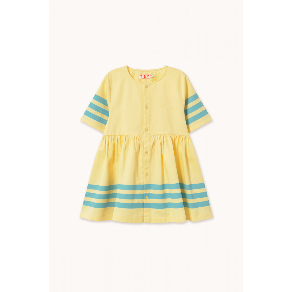 Ця коротка смугаста сукня світло-блакитного кольору на темно-жовтій основі пропонує свіжий, барвистий дизайн. З короткими рукавами, застібкою на ґудзиках спереду та легкою складкою на талії, вона поєднує в собі комфорт та стиль, а круглий виріз горловини забезпечує простий та універсальний вигляд.