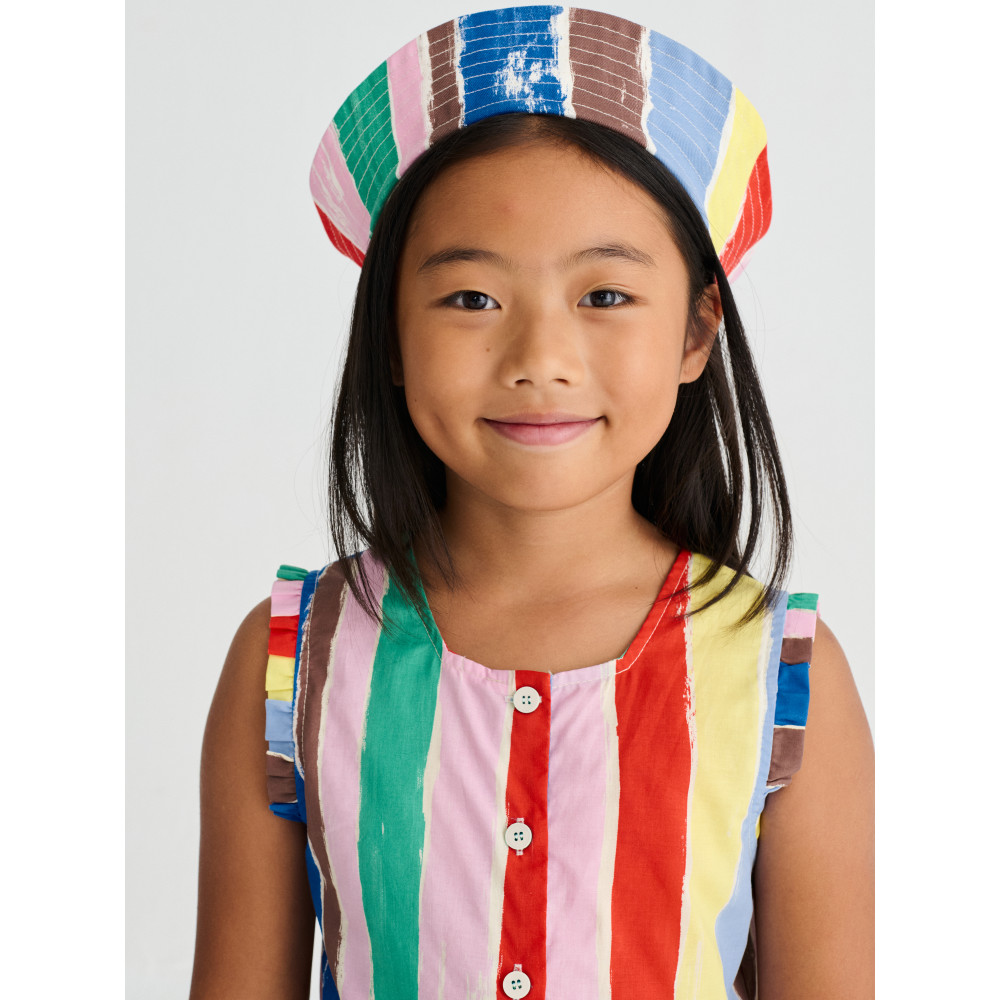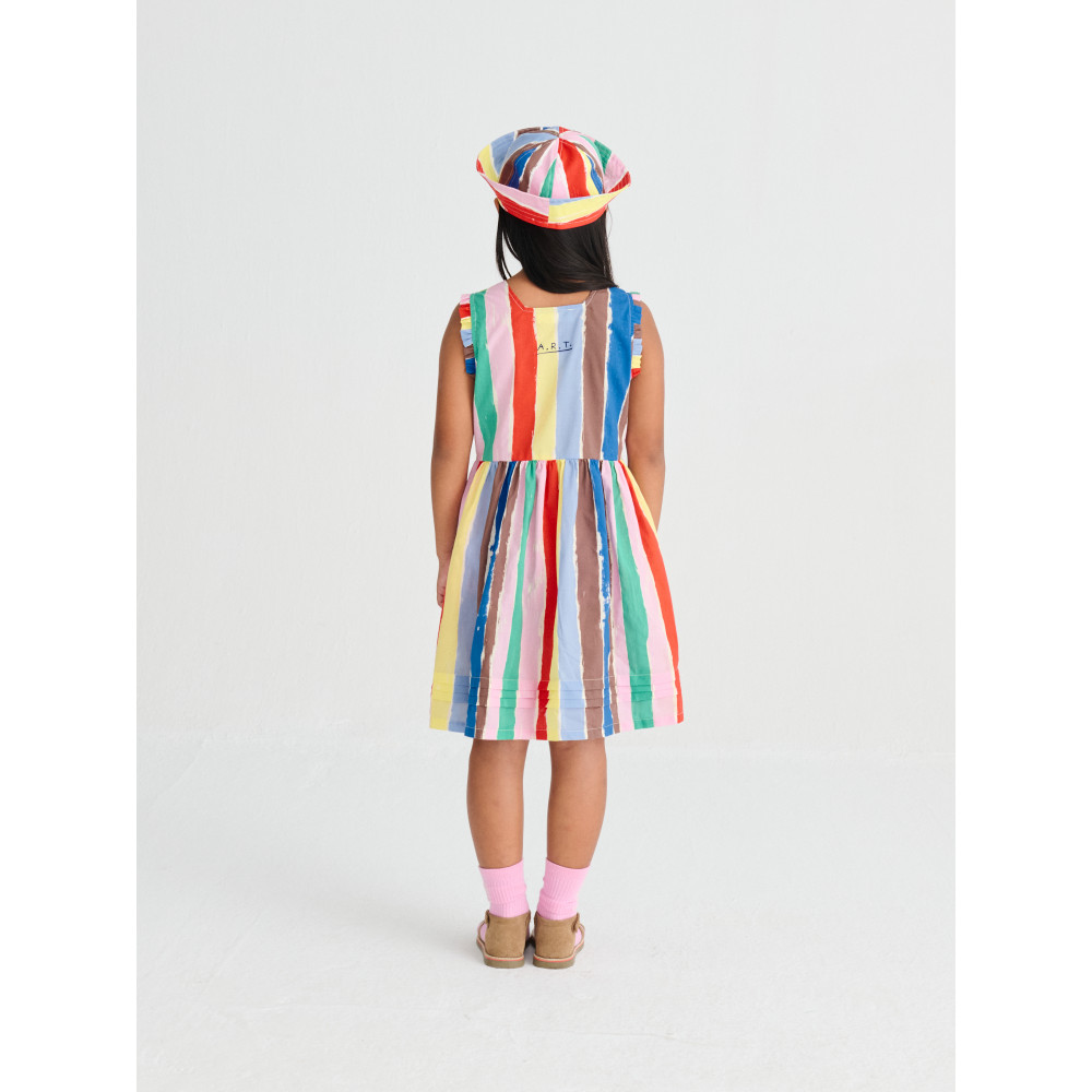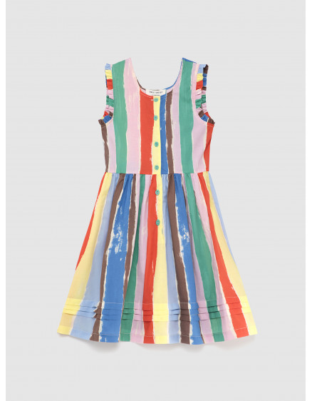 Сукня Strokes виготовлена зі 100% бавовни та має яскравий візерунок у смужку, що нагадує мазки художника. Ця сукня без рукавів має застібку на ґудзики спереду, круглий виріз горловини та невеликі рюші на бретельках. Вона має вільний крій та довжину до коліна. Виготовлено в Іспанії.