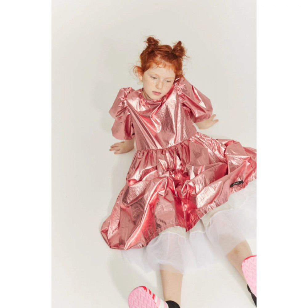 Яскраве рожеве, легке, грайливе і веселе. Деталі включають повітряні рукави та нижню спідницю з білого фатину, яка каскадом спускається нижче лінії подолу, створюючи об’єм і елемент вишуканості. Встановлює баланс між сміливістю та делікатністю.