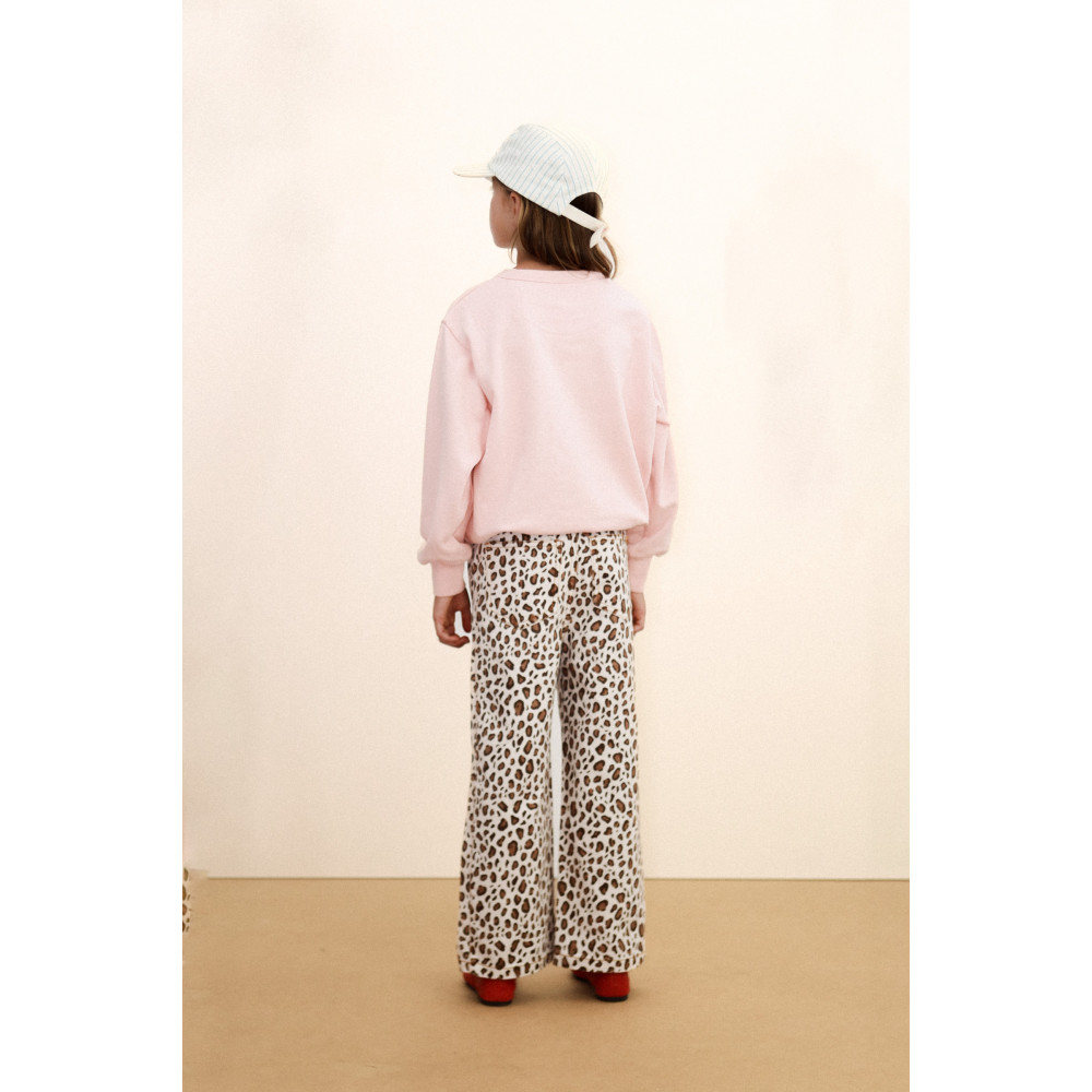 Ці джинсові штани з анімалістичним принтом виготовлені з міцної 100% бавовняної тканини. Розкльошений силует, регульований пояс і застібка на кнопки забезпечують комфортну та практичну посадку. Контрастна строчка додає свіжості та самобутності, а анімалістичний принт надає образу індивідуальності та цікавої деталі.