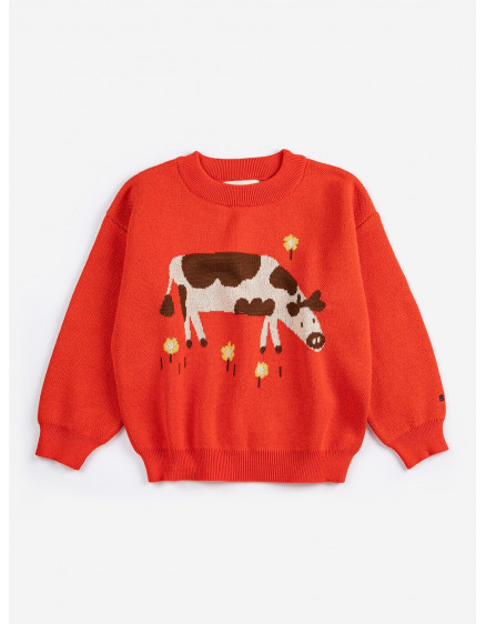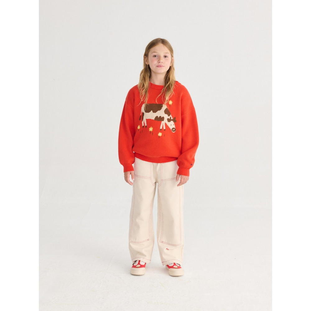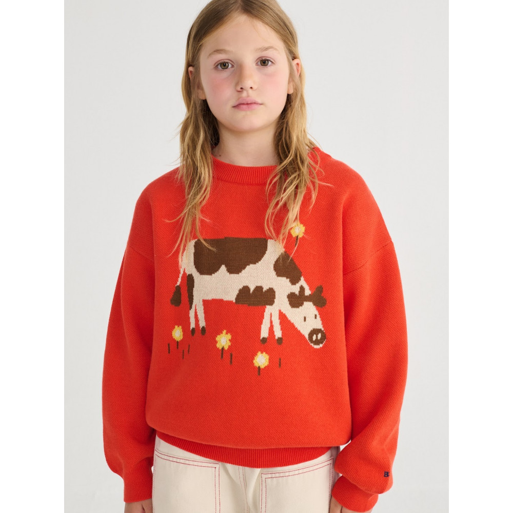 Червоний джемпер. Модель з довгими рукавами, спущеними плечима, ребристими манжетами, вишивкою, жакардовою тканиною, вільним кроєм, ребристим низом та круглим вирізом. Виготовлено в Іспанії.