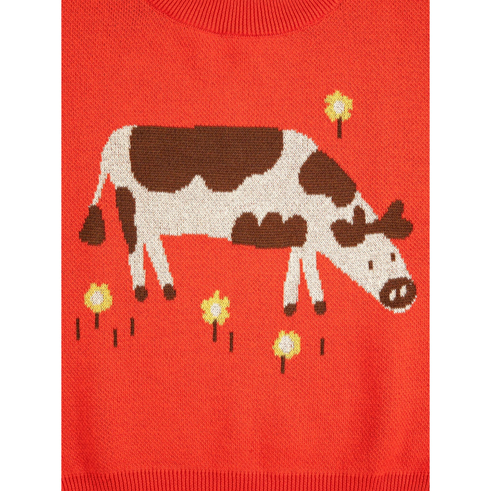 Червоний джемпер. Модель з довгими рукавами, спущеними плечима, ребристими манжетами, вишивкою, жакардовою тканиною, вільним кроєм, ребристим низом та круглим вирізом. Виготовлено в Іспанії.