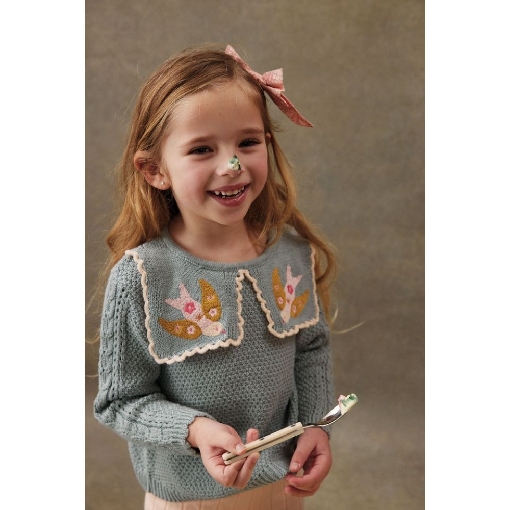 Однотонний в'язаний светр. Великий квадратний комір, прикрашений вишивкою та краями, вязаними гачком вручну. Закручені та ажурні деталі на рукавах. Краї манжетів, вязані гачком вручну. Застібка-крапелька ззаду на ґудзику.