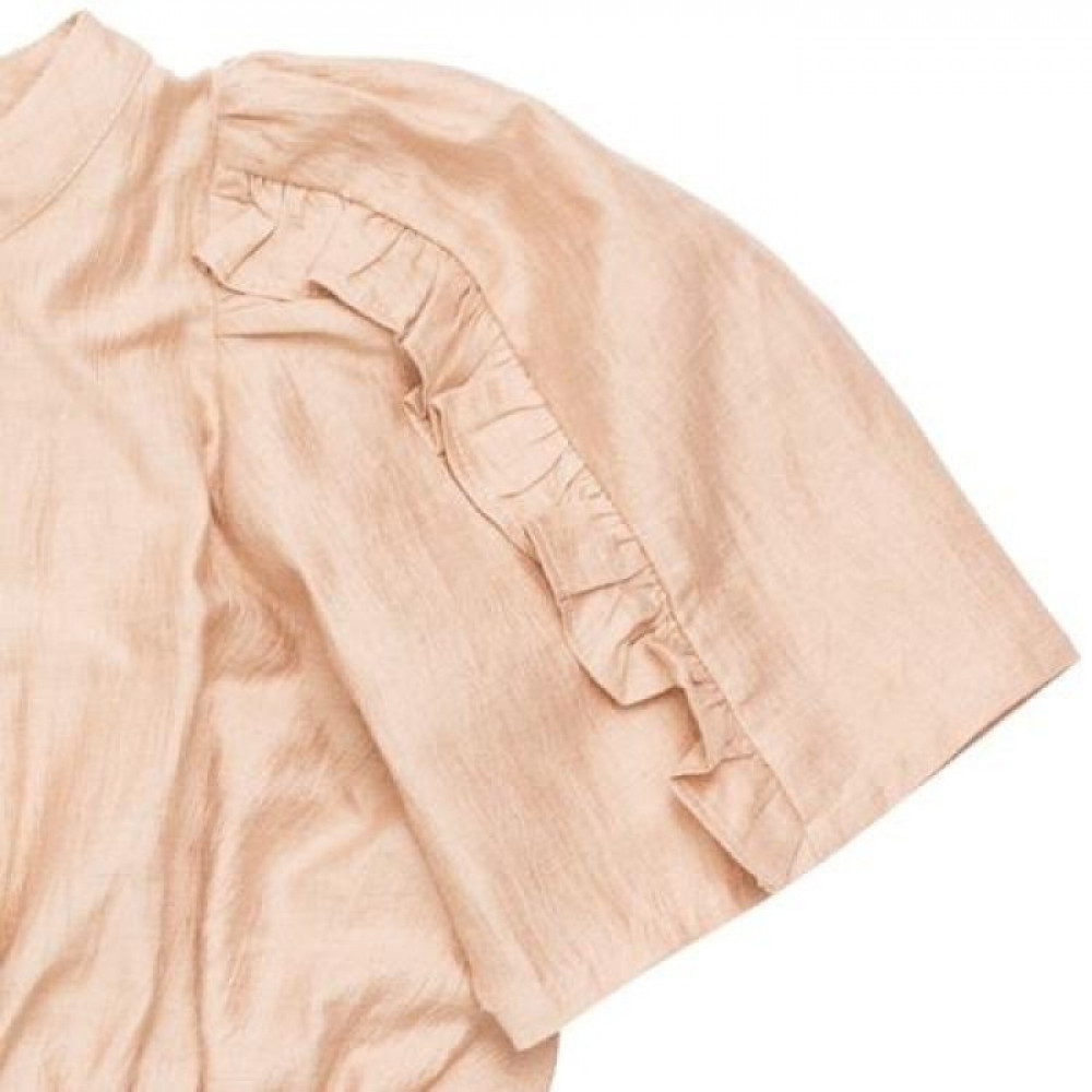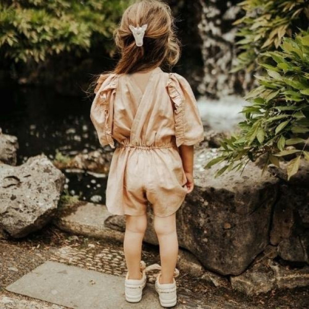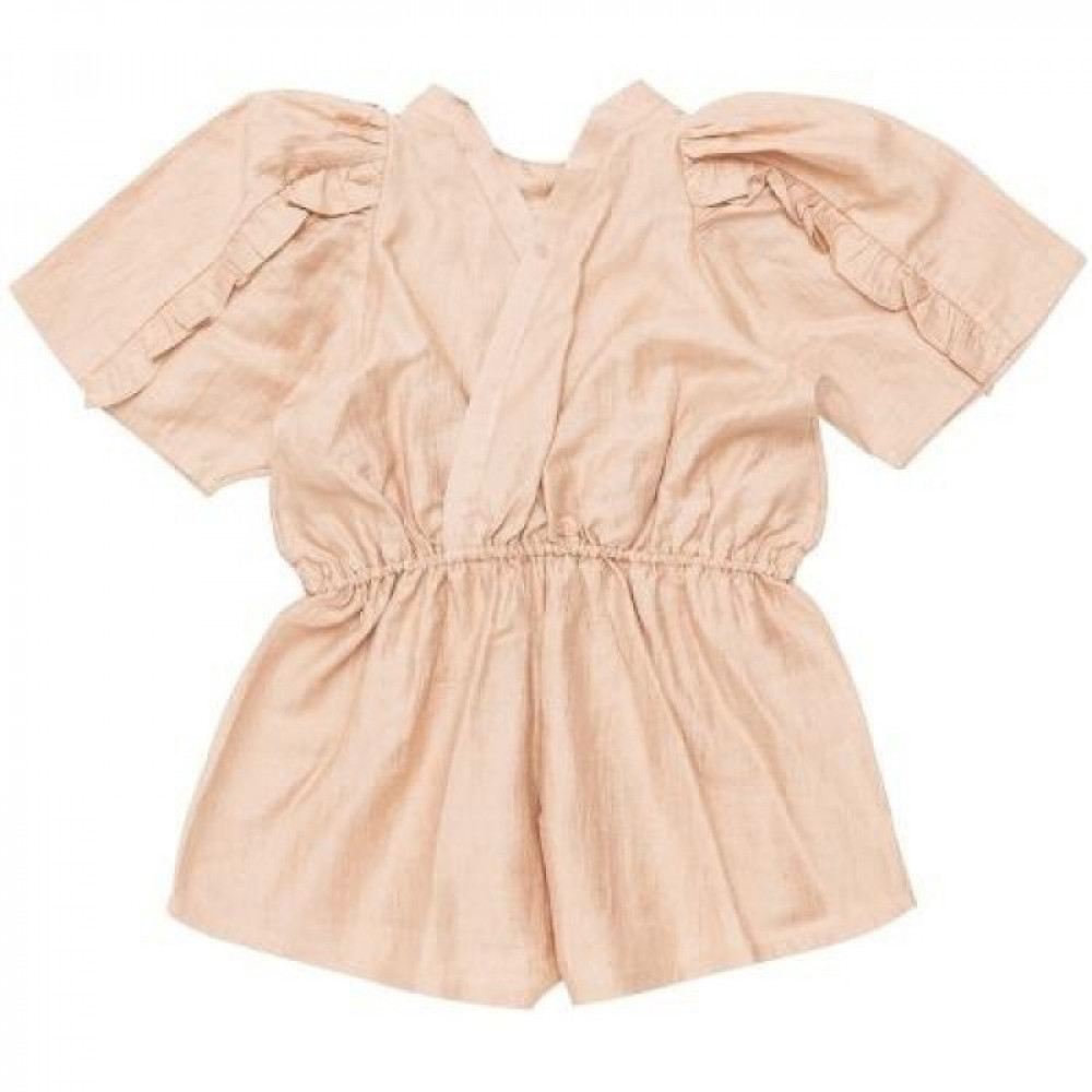 Цей чудовий комбінезон із короткими рукавами та короткими штанинами виконаний у старовинному рожевому кольорі мокко троянди. Комбінезон має гофровані деталі на рукавах, має еластичний край, тканина на спині перехрещена.