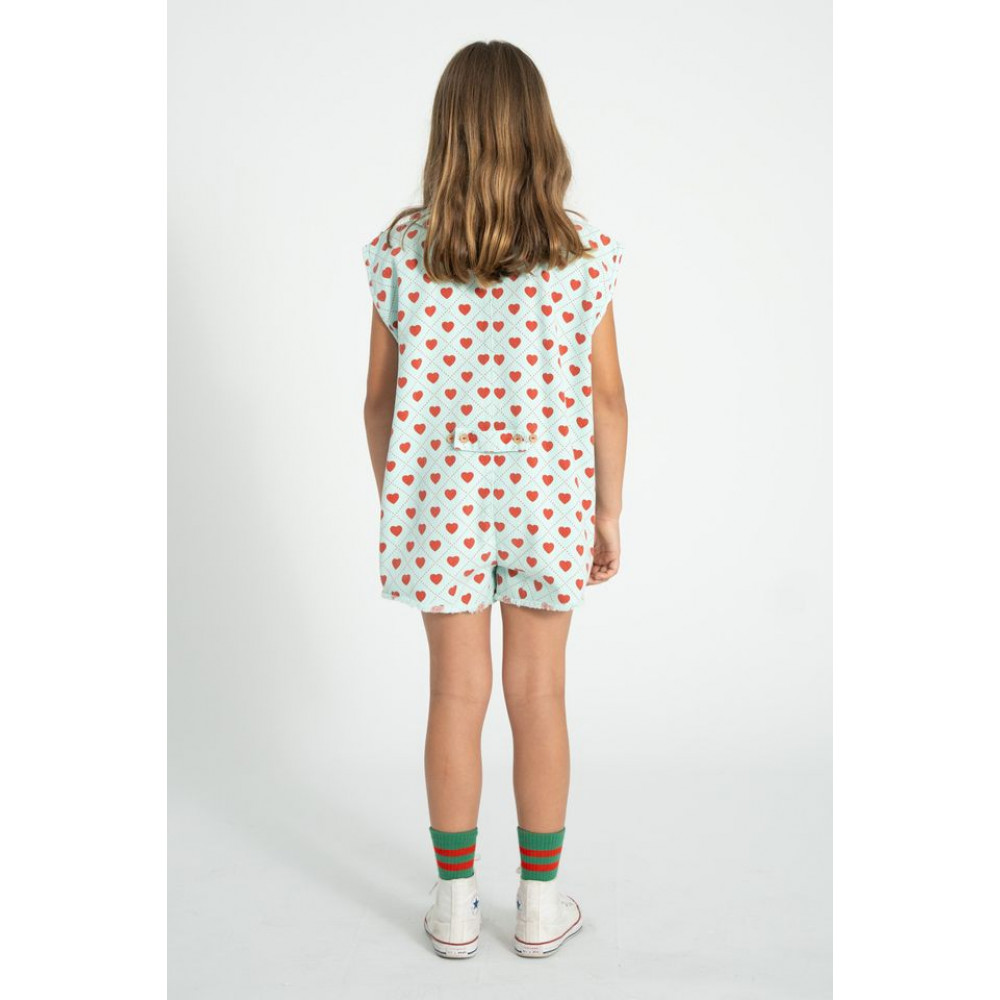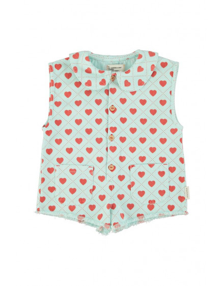 Короткий комбінезон без рукавів з круглим коміром та бахромою. Дві накладні кишені спереду. Дерев'яні ґудзики спереду. Детальніше з невеликим пояском на спині для кращої посадки. Прати в теплій воді (макс. 40ºC). Не відбілювати. Сушити при нормальній температурі, низькій. Прасувати при середній температурі (макс. 150°C). Хімчистка будь-яким розчинником, крім трихлоретилену. Прати навиворіт.