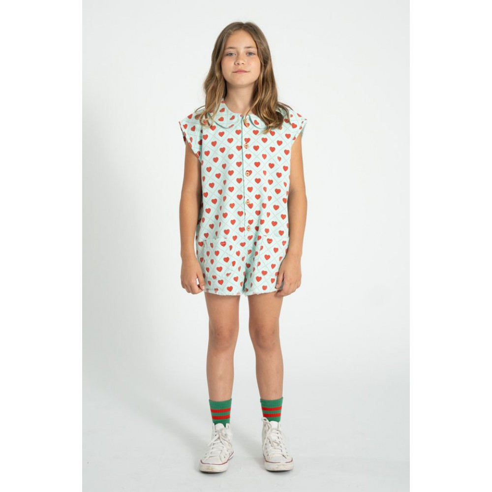 Короткий комбінезон без рукавів з круглим коміром та бахромою. Дві накладні кишені спереду. Дерев'яні ґудзики спереду. Детальніше з невеликим пояском на спині для кращої посадки. Прати в теплій воді (макс. 40ºC). Не відбілювати. Сушити при нормальній температурі, низькій. Прасувати при середній температурі (макс. 150°C). Хімчистка будь-яким розчинником, крім трихлоретилену. Прати навиворіт.