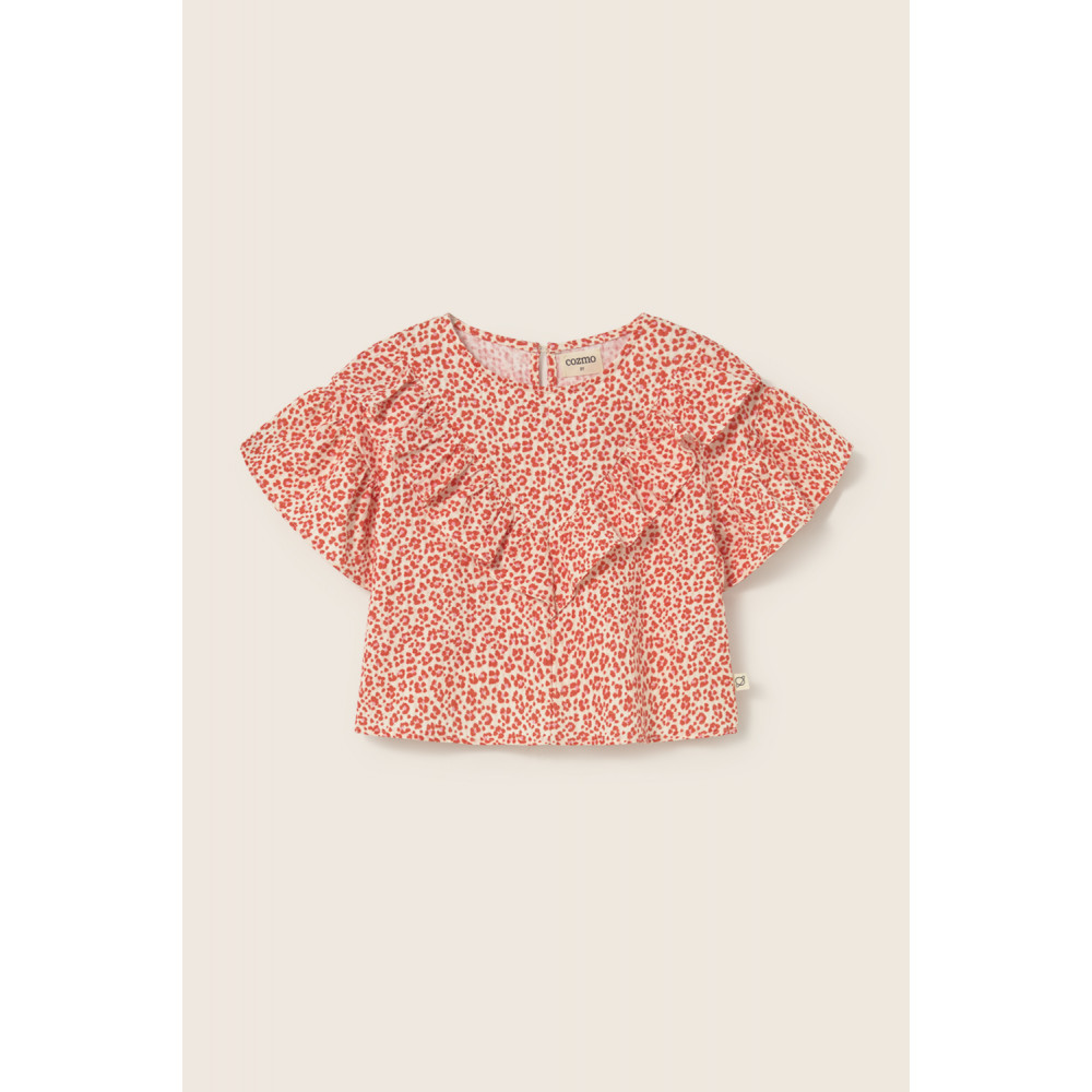 М'яка бавовняна блузка з тваринним принтом по всій поверхні. Круглий виріз горловини та застібка-краплеподібна застібка ззаду. V-подібна кокетка з рюшами, центральні шви спереду та ззаду, короткі рукави-вільти. Прямий поділ злегка укороченого крою.