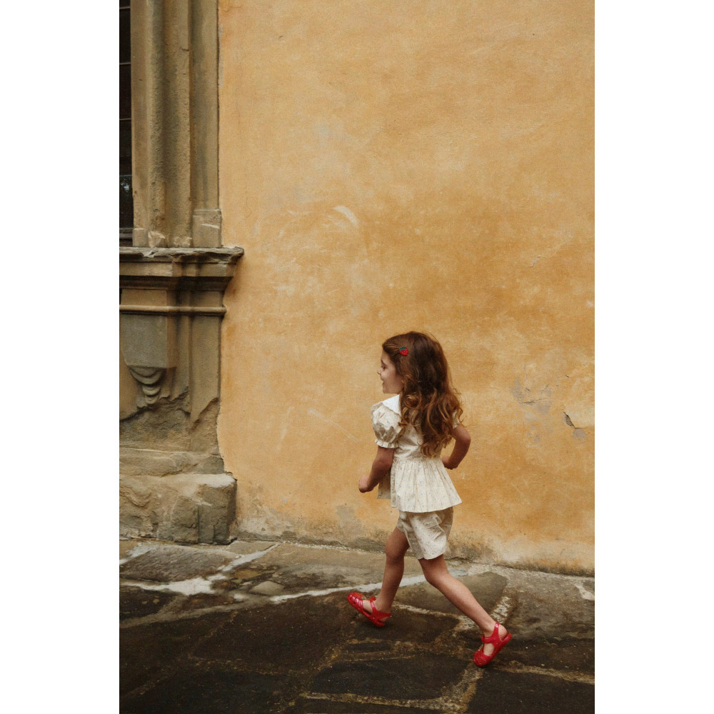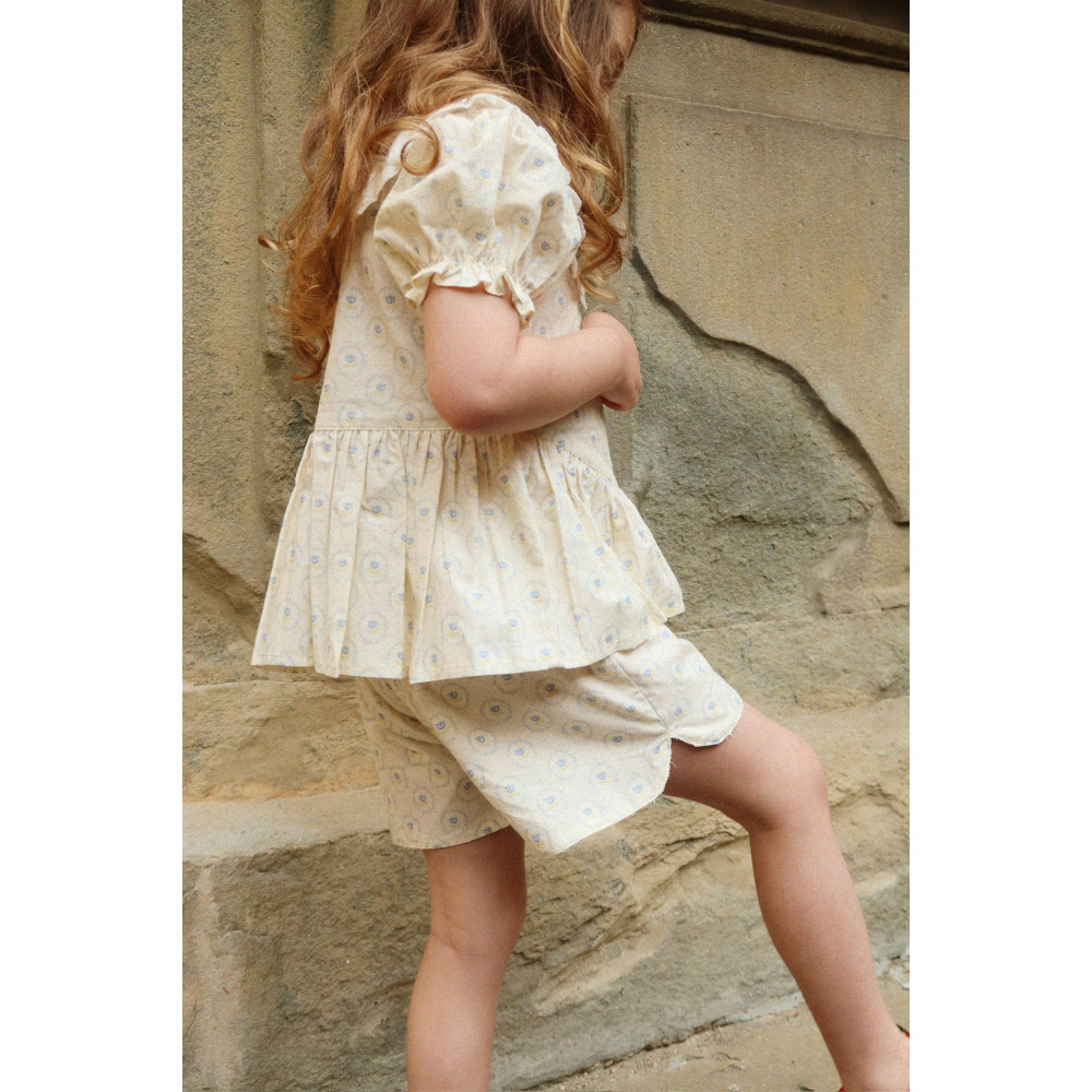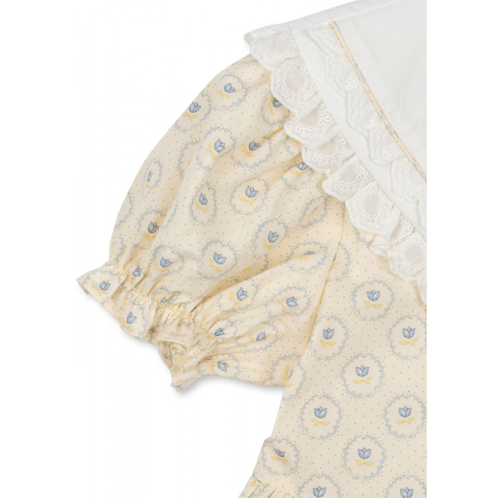М'яка літня блузка з класичним круглим мереживним коміром, привабливим силуетом з баскою та пишними рукавами. Застібка на ґудзики спереду з тканини та складки на манжетах.