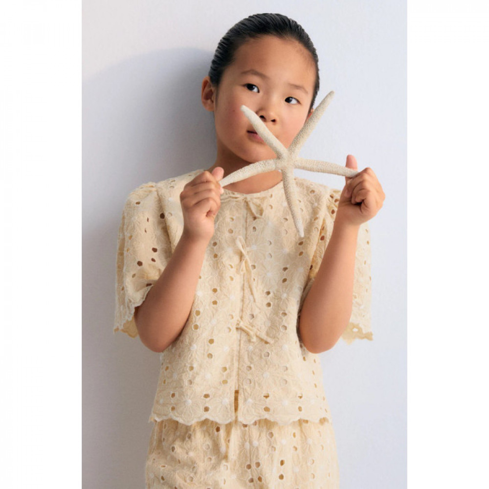 Блуза Creta — це красивий і універсальний предмет із нашої колекції, виготовлений із вишитої сумішевої бавовняної тканини ніжного кольору макадамії. Завдяки зібраним рукавам і високому вирізу ця блуза випромінює елегантність і шарм. Центральна застібка-бант додає дизайну витончену жіночність. Блузку Creta, яка ідеально підходить для поєднання зі спідницею або брюками в тон, можна легко одягнути на будь-який випадок. Непідвладне часу та стильне доповнення до гардеробу вашого малюка.