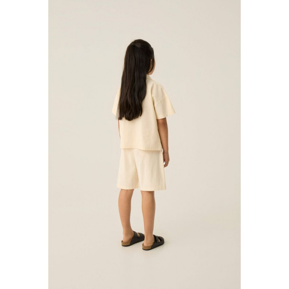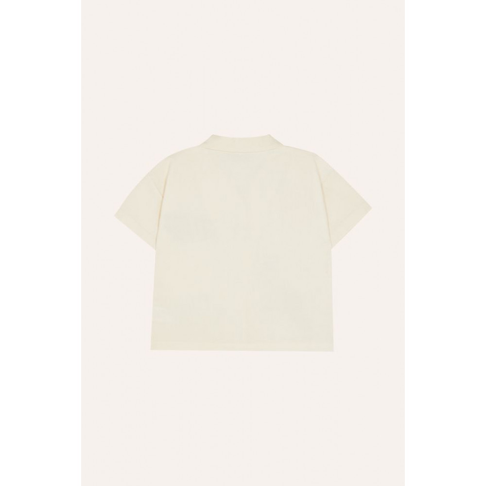 Сорочка з короткими рукавами, що розстібаються спереду на дерев'яних ґудзиках. Прикрашена різними елементами, нанесеними по всій поверхні. Виготовлена з м'якої бавовняної тканини, ідеально підходить для теплих літніх днів.