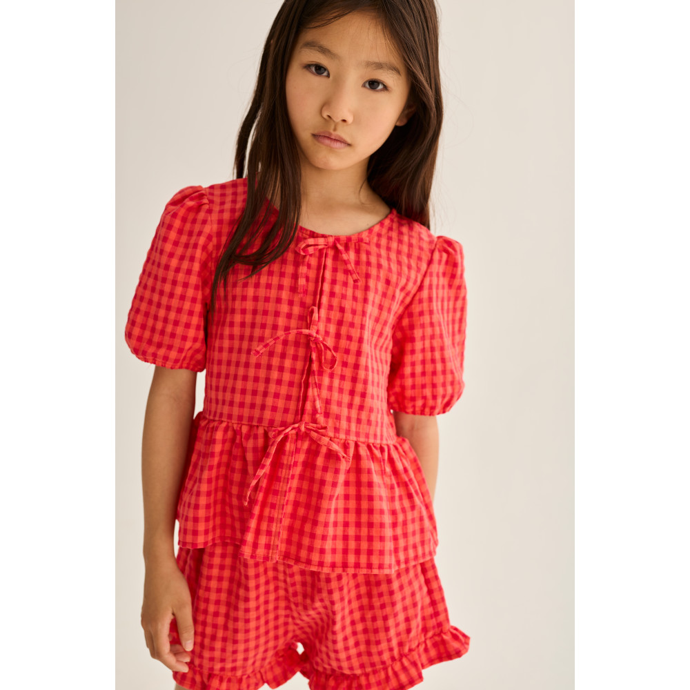 М'яка бавовняна блузка зі свіжим та яскравим візерунком у клітинку. Круглий виріз горловини. Краплеподібний отвір ззаду. Декоративна планка спереду з фіксованим бантом. Короткі пишні рукави та еластичні манжети. Зібрані на талії. Оборки по низу.