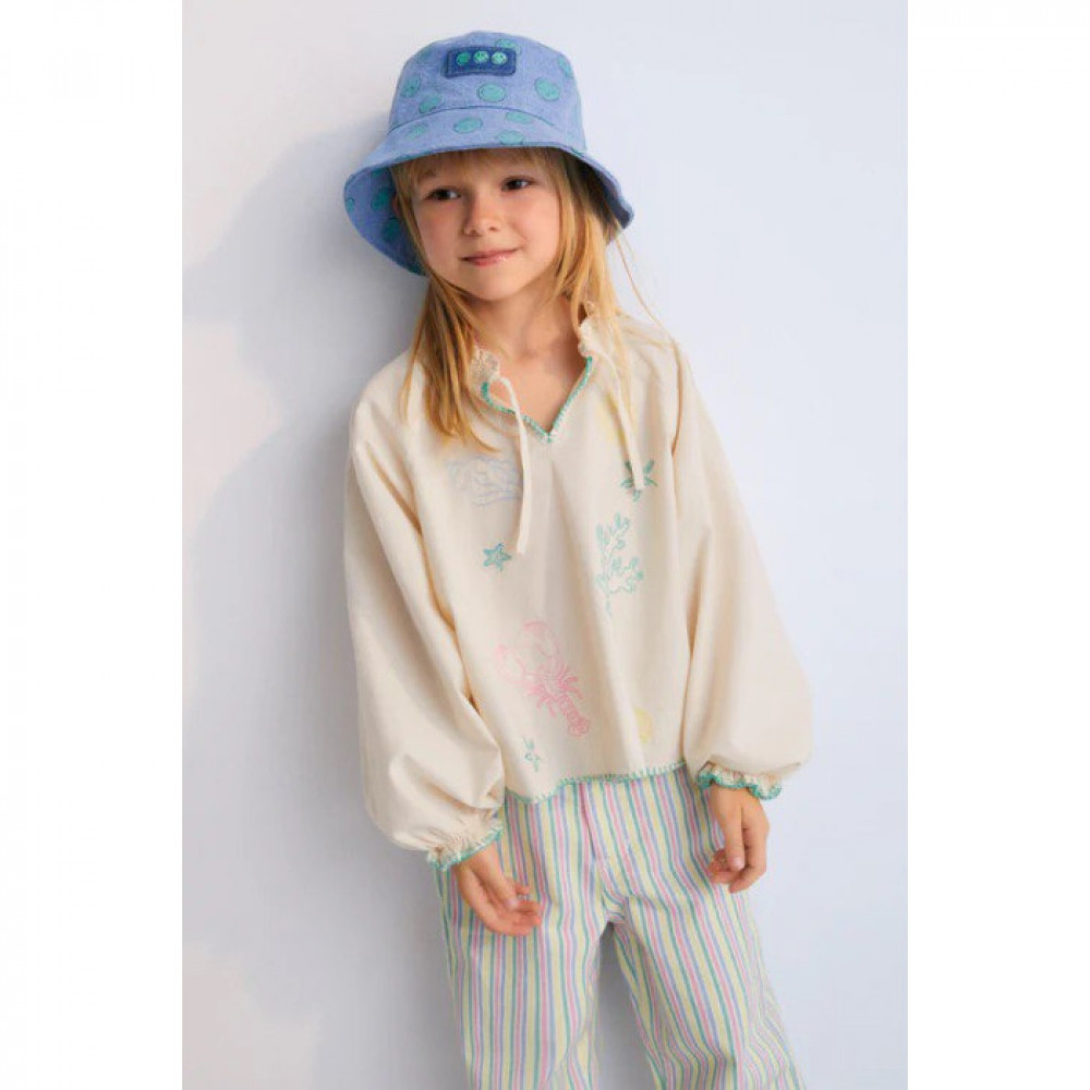 Блуза Kostas зі 100% бавовняної тканини з витонченим коміром із рюшами та бан том із V-подібним вирізом для додання елегантності. Ця блуза з рукавами-духа ми та прикрашена фірмовою вишивкою колекції поєднує в собі жіночність і шарм. Ідеально підходить для поєднання з шортами Kostas або будь-яким із ваших улюблених літніх речей. Машинне прання 30º/не відбілювати/не сушити в пральній машині/прасувати при середній температурі/хімчистка, будь- який розчинник, крім трихлоретилену.
