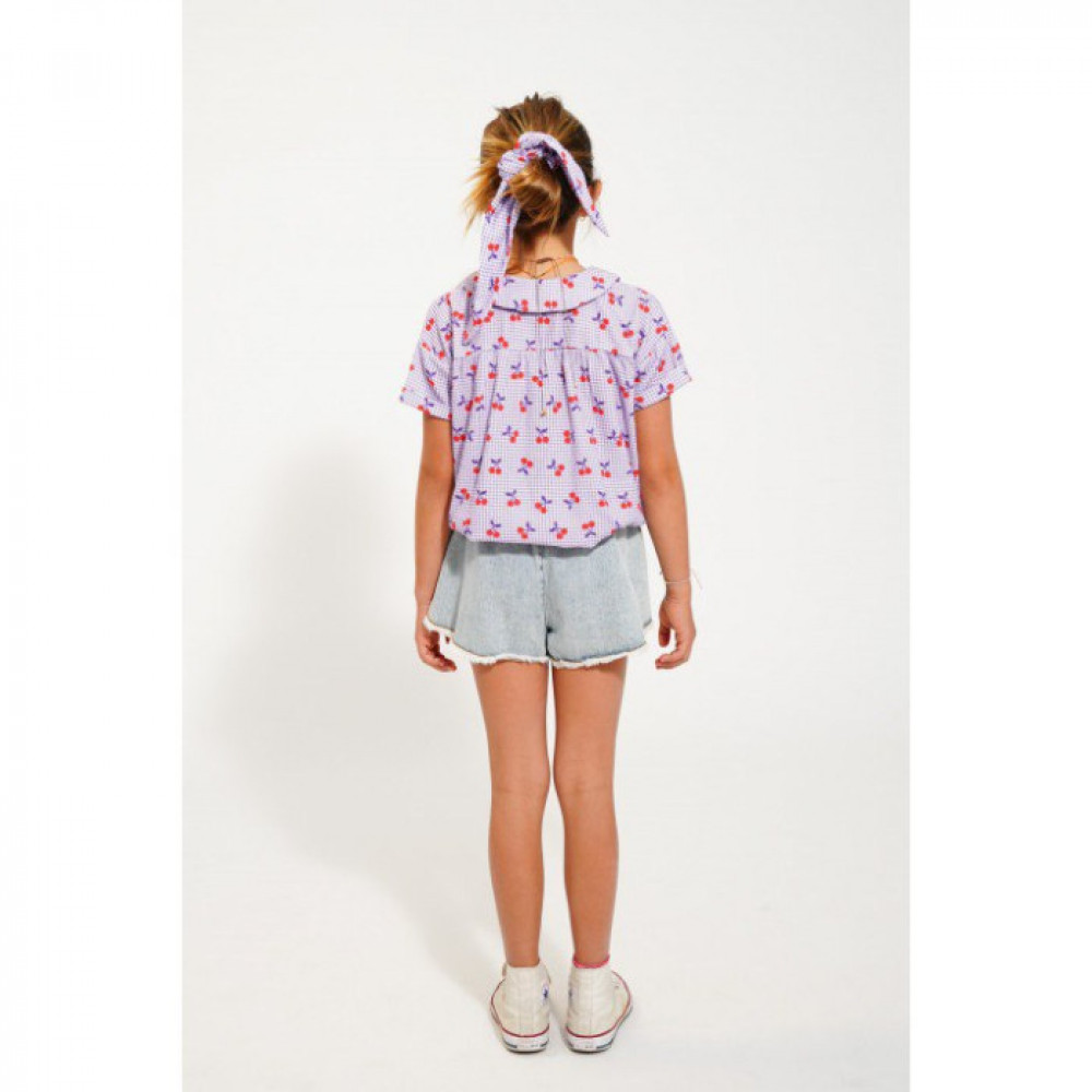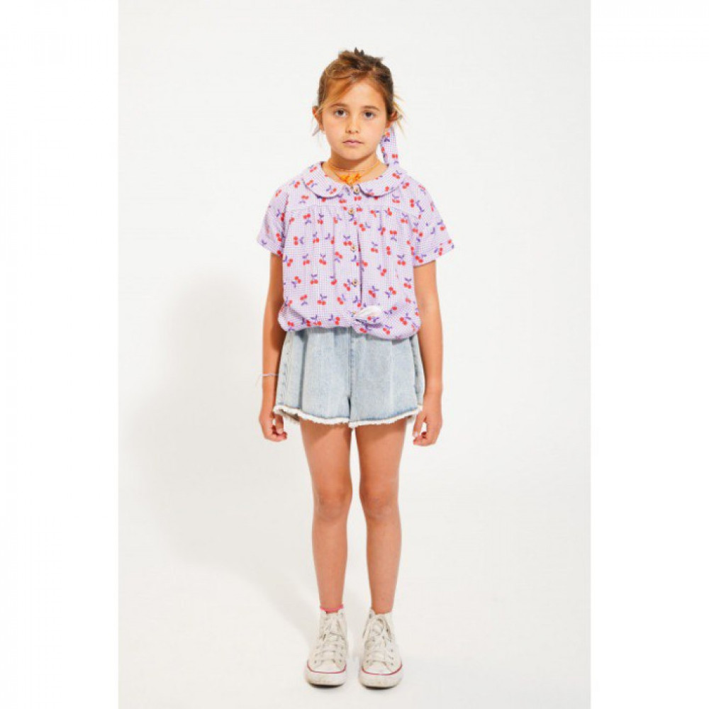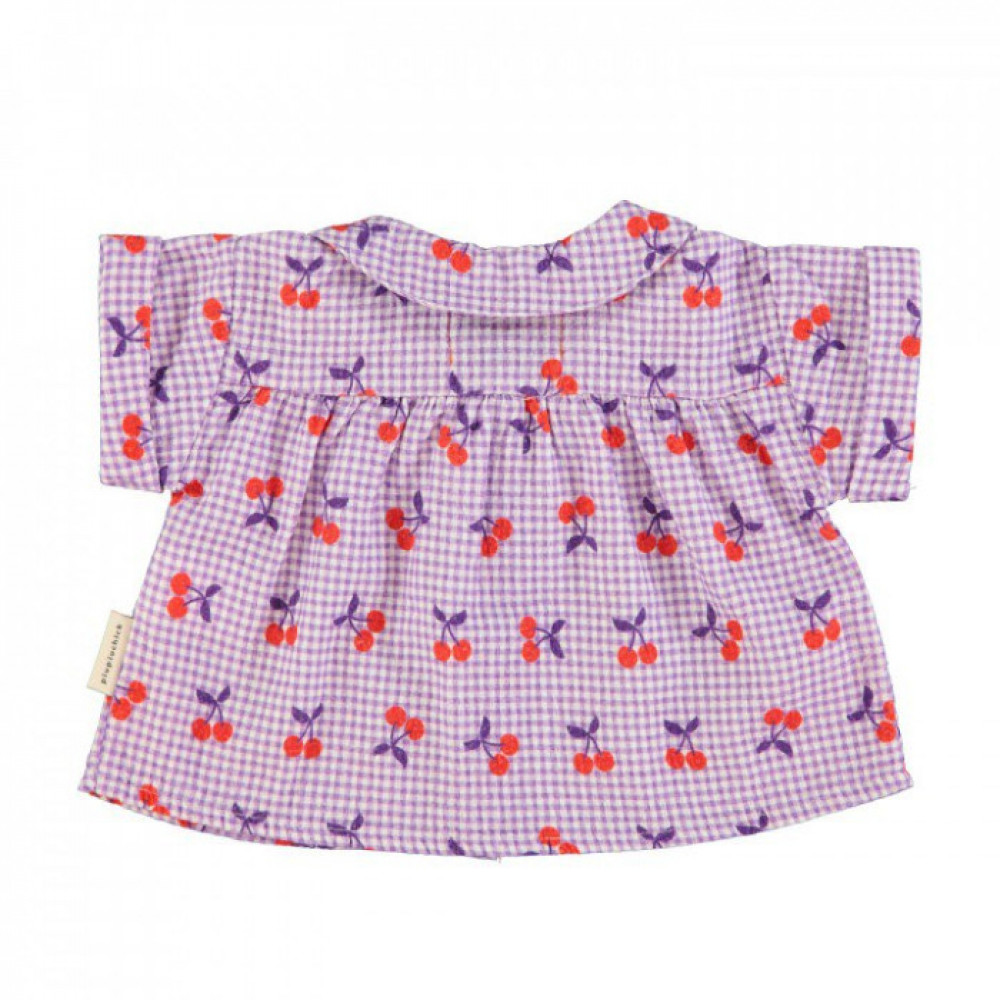 Сорочка з коміром Пітер Пен з короткими рукавами. Дерев'яні гудзики спереду. Фіолетово-біла картата з вишнями.
