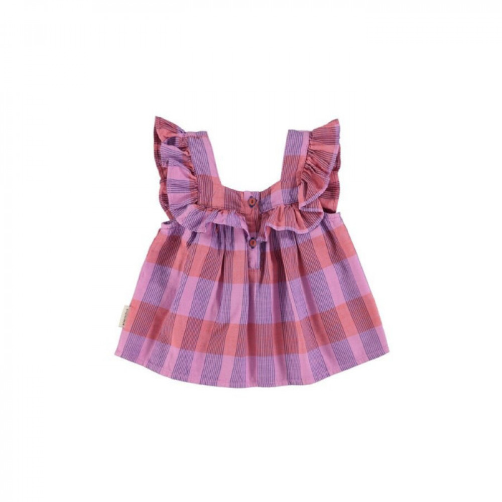 Блуза без рукавів з квадратним горлом і спинкою, помаранчево-блакитними ґудзиками. Деталізований рукавами з оборками.