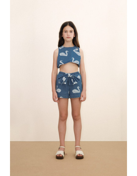 Ці шорти з принтом «Великі лебеді» поєднують комфорт і стиль у грайливому та практичному дизайні. Завдяки зібраному еластичному поясу, боковим кишеням і фіксованому банту спереду, вони забезпечують комфортну посадку та чарівний штрих, що доповнить будь-який літній образ.