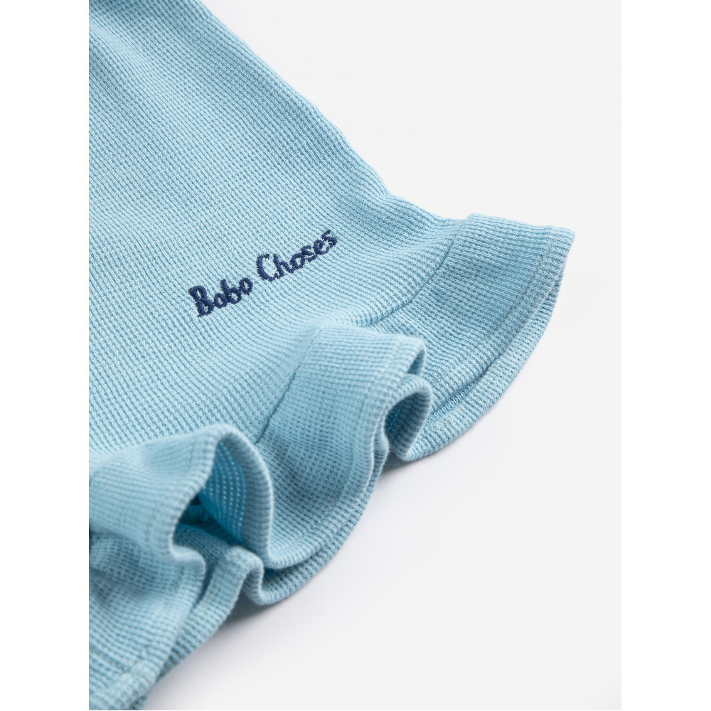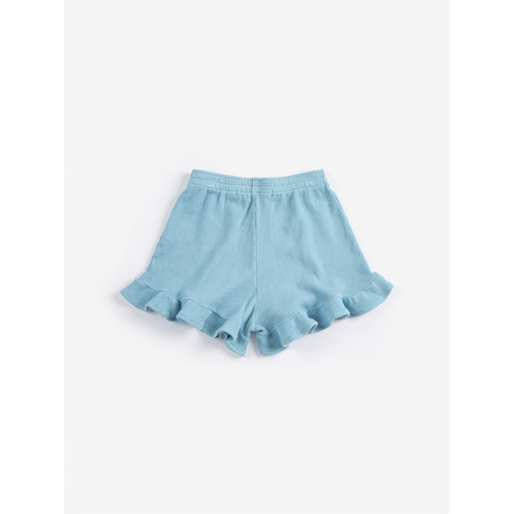 Світло-блакитні шорти. З еластичним поясом, вишивкою, короткі, вільного крою та рюшами.
