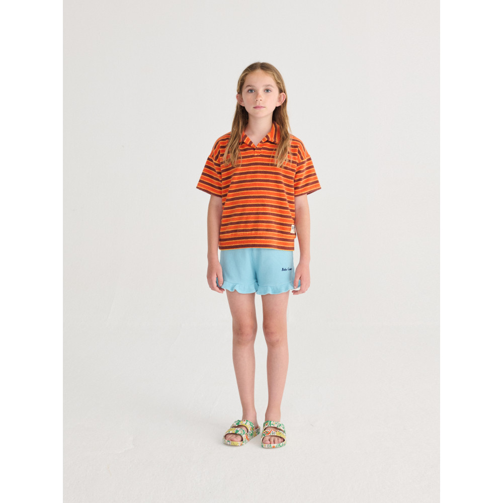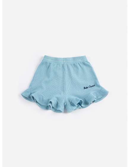 Світло-блакитні шорти. З еластичним поясом, вишивкою, короткі, вільного крою та рюшами.