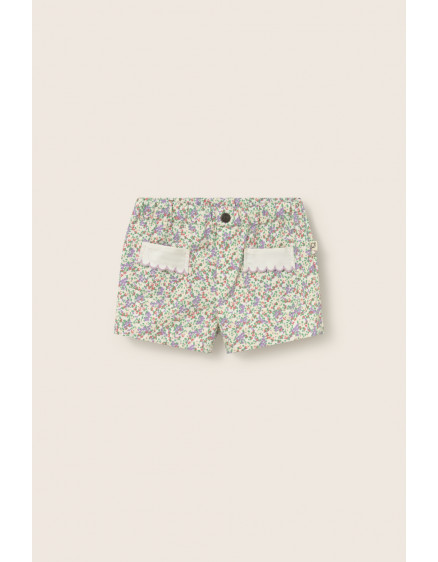 Шорти з м'якої та повітряної бавовняної саржі. Еластичний регульований пояс з декоративною застібкою-ґудзиком. Імітація ширинки. Накладні кишені спереду з фестончастим клапаном однотонного кольору. Яскравий квітковий принт по всій поверхні.