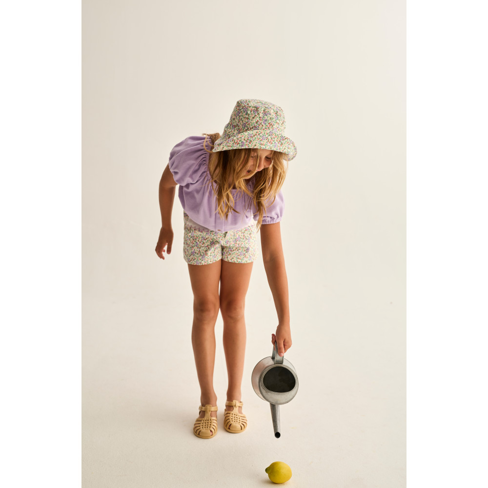 Шорти з м'якої та повітряної бавовняної саржі. Еластичний регульований пояс з декоративною застібкою-ґудзиком. Імітація ширинки. Накладні кишені спереду з фестончастим клапаном однотонного кольору. Яскравий квітковий принт по всій поверхні.