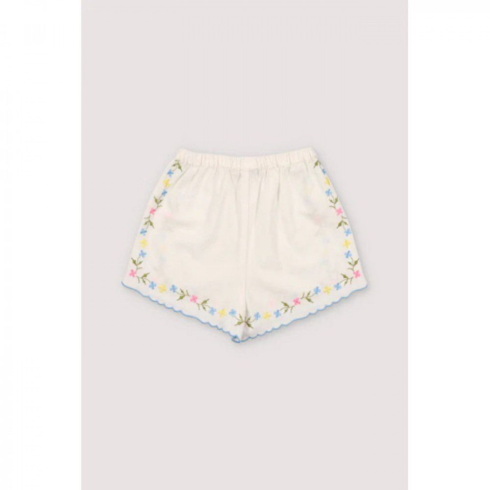 Шорти Hermione Short, виготовлені зі 100% білої бавовняної тканини, мають ніжну вишивку квітів, натхненну вінтажною серветкою, яку дизайнер знайшов у Мадриді. Ці шорти, розроблені з еластичним поясом і регульованим шнурком для комфортної посадки, прикрашені вишивкою квітів і оброблені тонкими деталями синього кольору. Ідеально підходить для теплих днів, Hermione Short чудово поєднується з блузою, створюючи злагоджений, невимушений стильний образ, який випромінює елегантність і шарм. Зроблено в Португалії