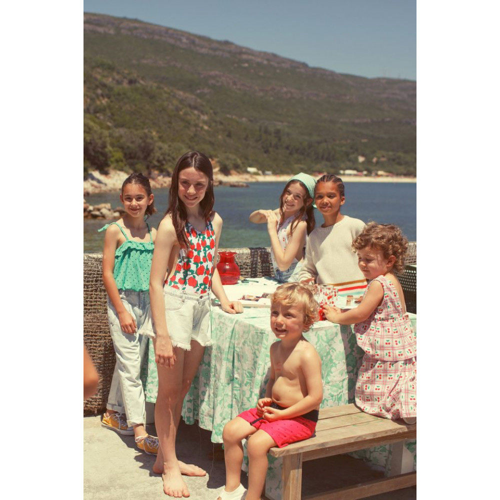 Шорти вільного крою з бахромою та регульованим еластичним поясом. Декор з червоною вишивкою логотипу на одній задній кишені. Прати в холодній воді (макс. 30ºC). Не відбілювати. Сушити при нормальній температурі, при низькій температурі. Прасувати в прохолодній воді (макс. 110ºC). Не піддавати хімічному чищенню. Вологе чищення. Прати навиворіт. Прати окремо. Вплив сонця або інтенсивного світла може призвести до зміни кольору.