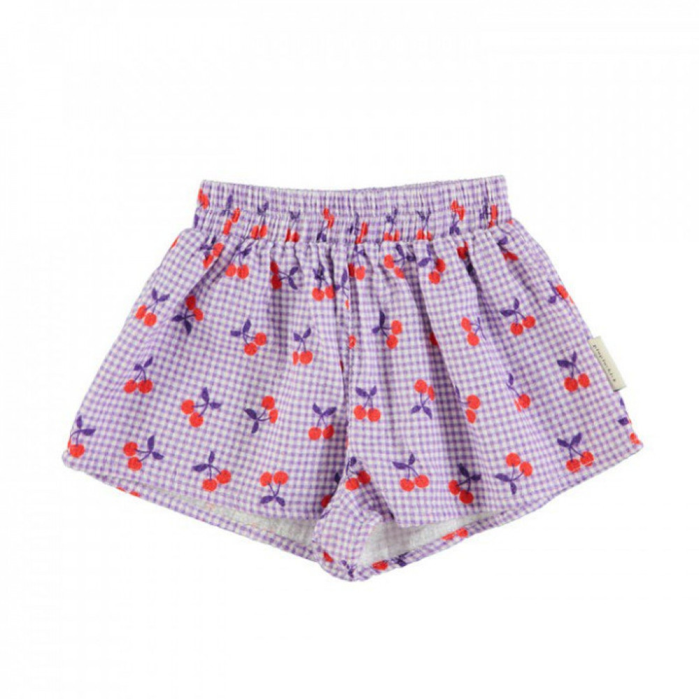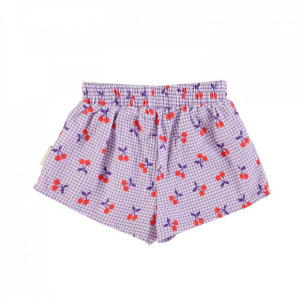 Шорти з еластичною талією. Фіолетово-біла картата з вишнями тканина.