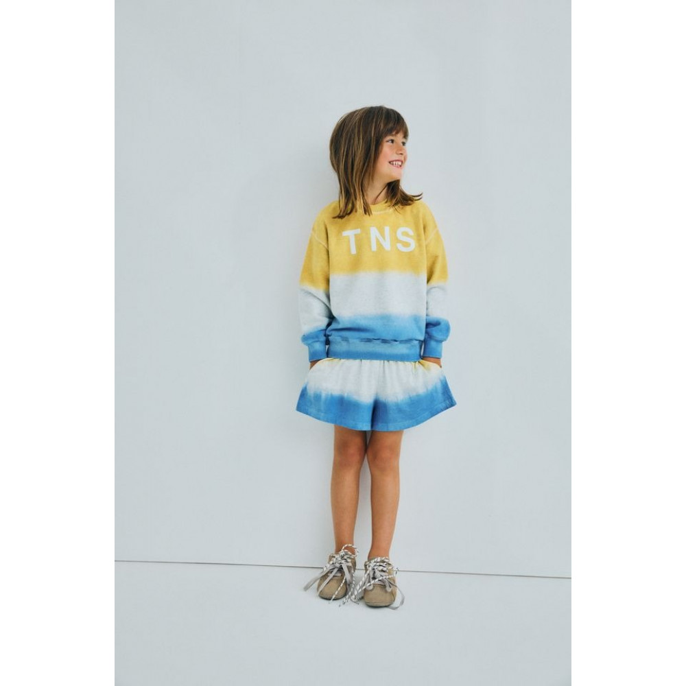 Шорти з меланжевого бавовняного трикотажу з двоколірним ефектом тай-дай. Мають бічні кишені та еластичний пояс. Ідеально підходять для повного образу тай-дай.