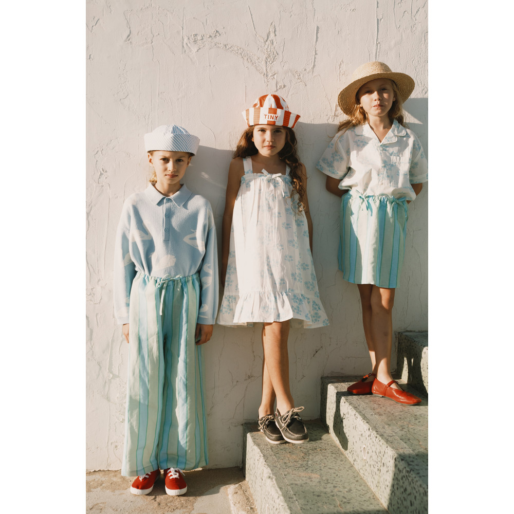 Ця спідниця з принтом у ретро-смуги – ідеальне поєднання комфорту та стилю. Виготовлена з м’якої бавовняної суміші з повітропроникними властивостями, вона забезпечує свіжість та комфорт протягом усього дня. Спідниця має вільний силует з еластичним поясом для легкого та комфортного носіння, а штучні зав’язки додають декоративний штрих, що робить її одночасно унікальною та сучасною.