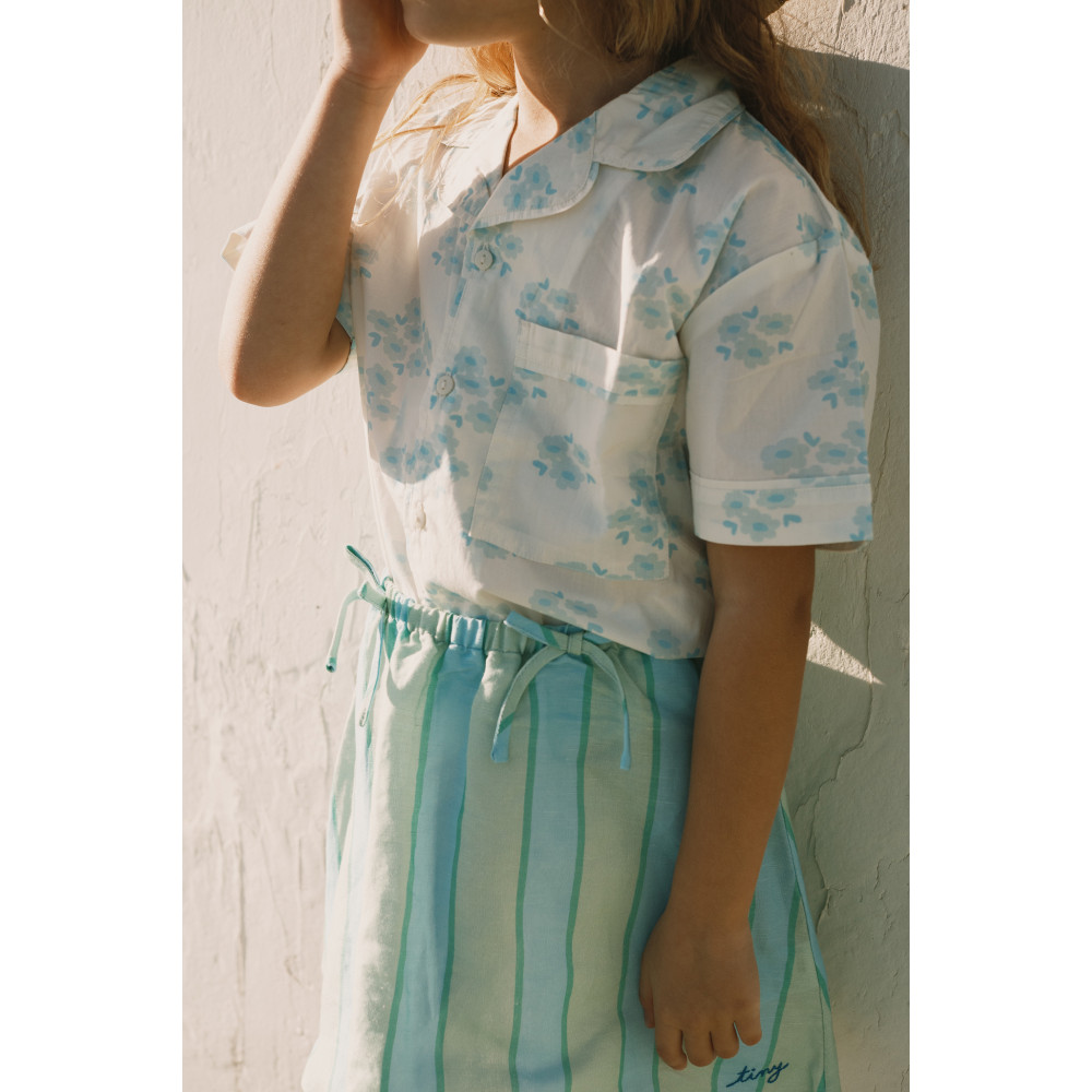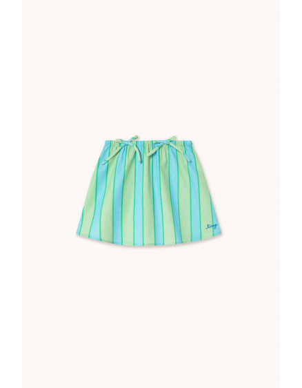 Ця спідниця з принтом у ретро-смуги – ідеальне поєднання комфорту та стилю. Виготовлена з м’якої бавовняної суміші з повітропроникними властивостями, вона забезпечує свіжість та комфорт протягом усього дня. Спідниця має вільний силует з еластичним поясом для легкого та комфортного носіння, а штучні зав’язки додають декоративний штрих, що робить її одночасно унікальною та сучасною.