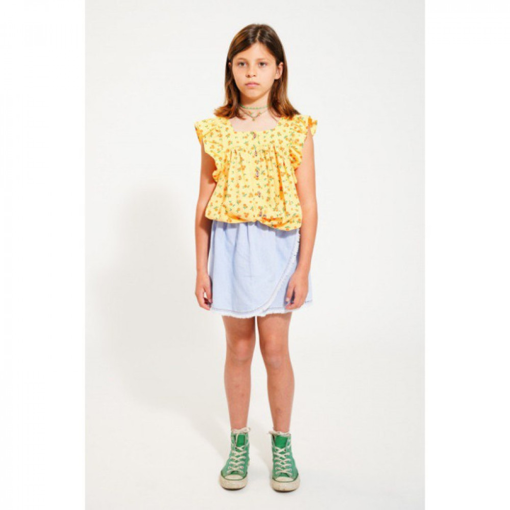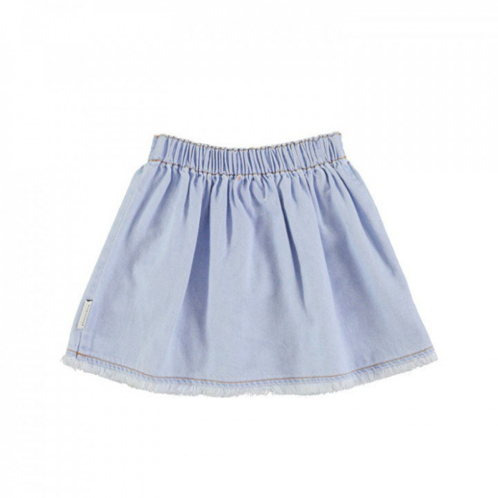 Коротка спідниця з м’якого деніму з перехрещеними спереду та бахромою.