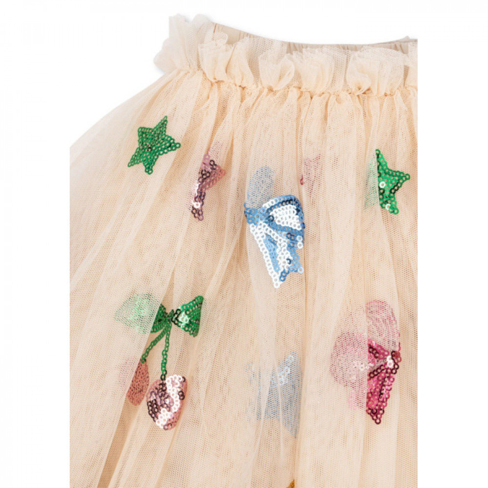 Об'ємна спідниця з фатину з м'якою бавовняною підкладкою та еластичною талією. Прикрашена вишивкою паєтками.