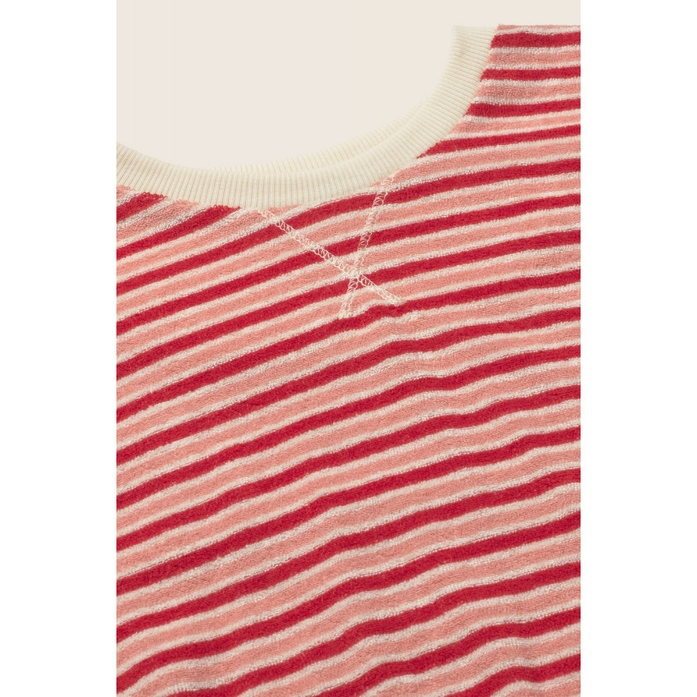 Смугастий светр з м'якої махрової тканини. Круглий виріз горловини. Вишита Х-подібна літера на горловині. Спущені плечі та довгі рукави. Закруглена вставка з внутрішньої сторони. Ребриста обробка на горловині, манжетах та подолу.