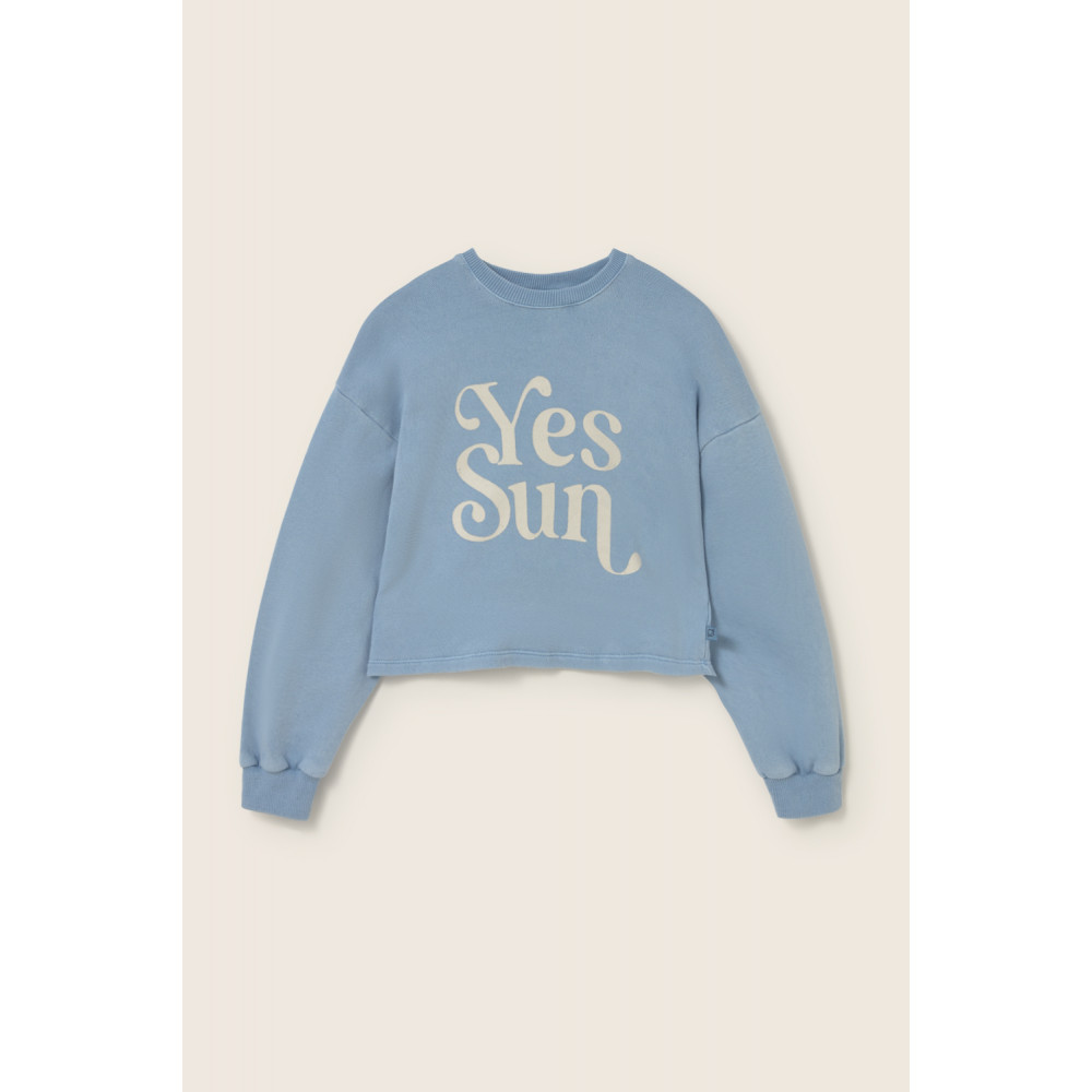 Светр з бавовняного флісу з ніжною текстурою. Круглий виріз горловини. Спущені плечі та злегка пишні довгі рукави. Ребриста смуга на горловині та манжетах. Друкований мотив з написом "Yes, Sun".