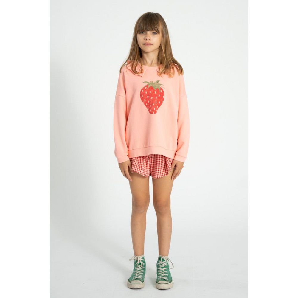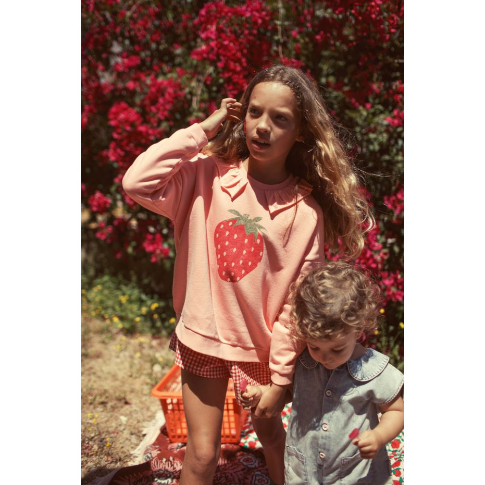 Светр із заокругленим коміром з рюшами. Ребристі нижні краї. Фронтальний принт. Дитячі розміри мають дерев'яні ґудзики на спині. Прати в холодній воді (макс. 30ºC). Не відбілювати. Не сушити в сушильній машині. Прасувати в прохолодній воді (макс. 110ºC). Не піддавати хімічному чищенню.