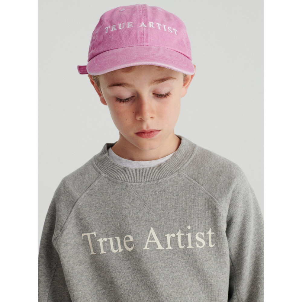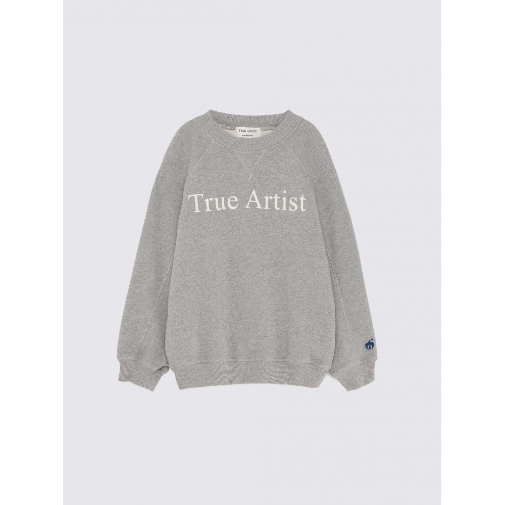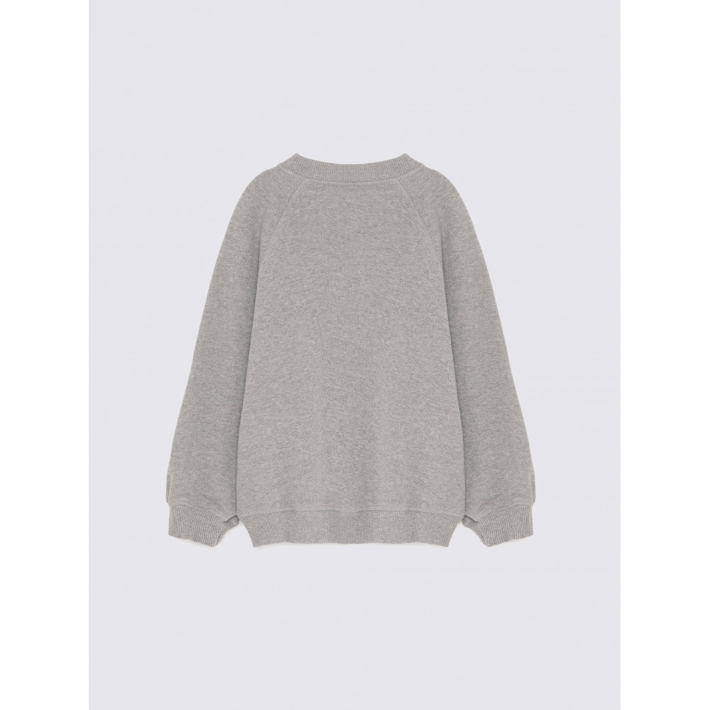 Светр №01 кольору Меланж-сірий виготовлений зі 100% бавовни та має наш літерний логотип, надрукований спереду. Він має рукави-ранглан, ребристі манжети та низ, а також вишитий логотип нашого птаха на рукаві. Має вільний крій. Виготовлено в Португалії.