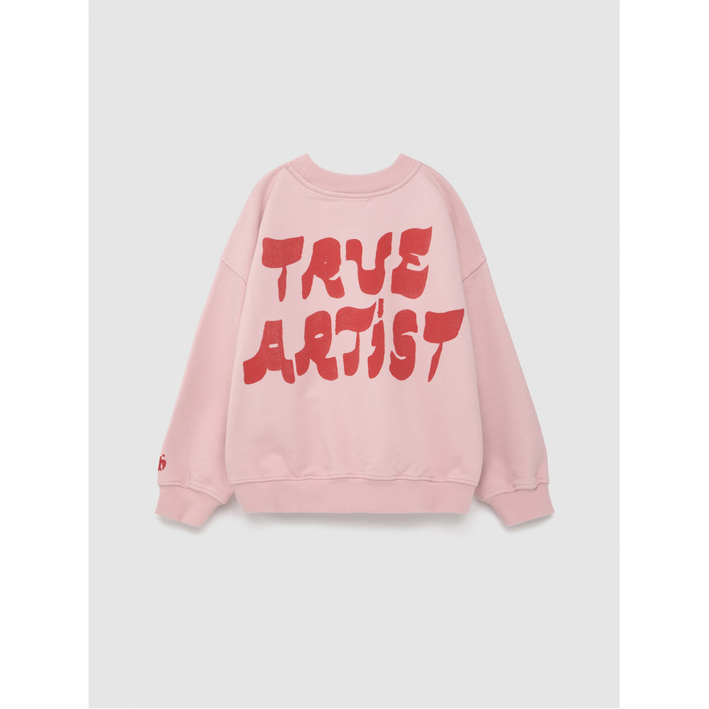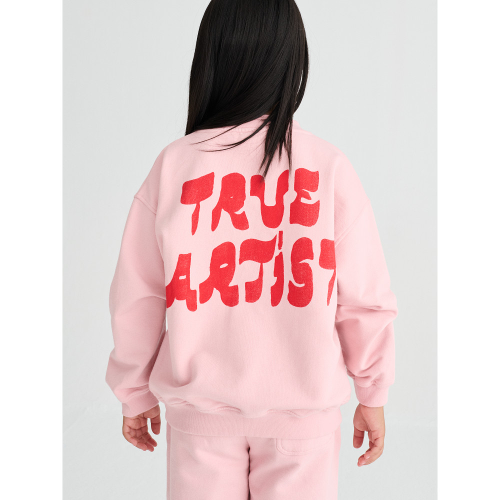 Светр №11 кольору Cameo Pink виготовлений з 98% органічної бавовни та 2% еластанового флісу. Ззаду він прикрашений сезонним принтом True Artist, а спереду — вишивкою у вигляді маленького птаха. Він має круглий ребристий комір, спущені плечі, а також ребристі манжети та низ. Має вільний крій. Виготовлено в Португалії.