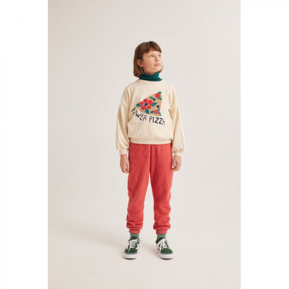 100% органічна бавовняна текстура флісу кольору слонової кістки. Кругла горловина, довгі рукави з еластичними манжетами в рубчик і по лінії талії. Спереду «квіткова піца» - піца з фруктами. Трохи маломірний.