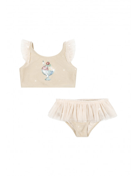 М'яке бікіні з мерехтливим покриттям та тюлевими деталями. Низ оздоблений об'ємними тюлевими деталями. Створене для веселих днів на пляжі чи біля басейну, бікіні Amandine виготовлене з швидковисихаючого матеріалу, який є легким та комфортним у носінні.