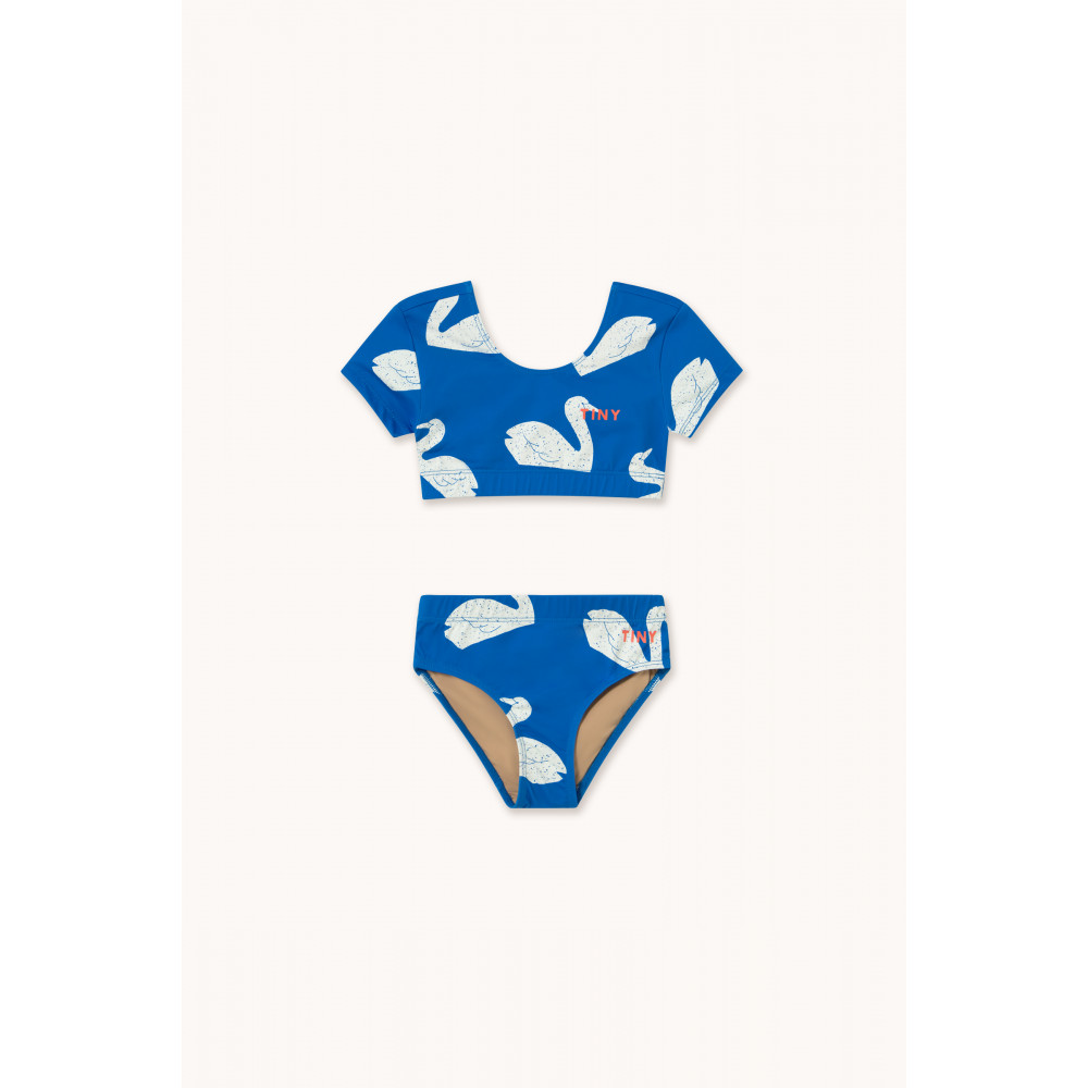 Цей двопредметний купальний комплект із принтом «Великі лебеді» на синьому фоні поєднує в собі веселість, комфорт та стиль. Він складається з укороченого топа з короткими рукавами та круглим вирізом горловини, а також низу в тон з еластичним поясом для комфортної та надійної посадки. Виготовлений з еластичної тканини, що швидко висихає, він забезпечує повну свободу рухів, що робить його практичним та чарівним вибором для сонячних днів та ігор у воді.