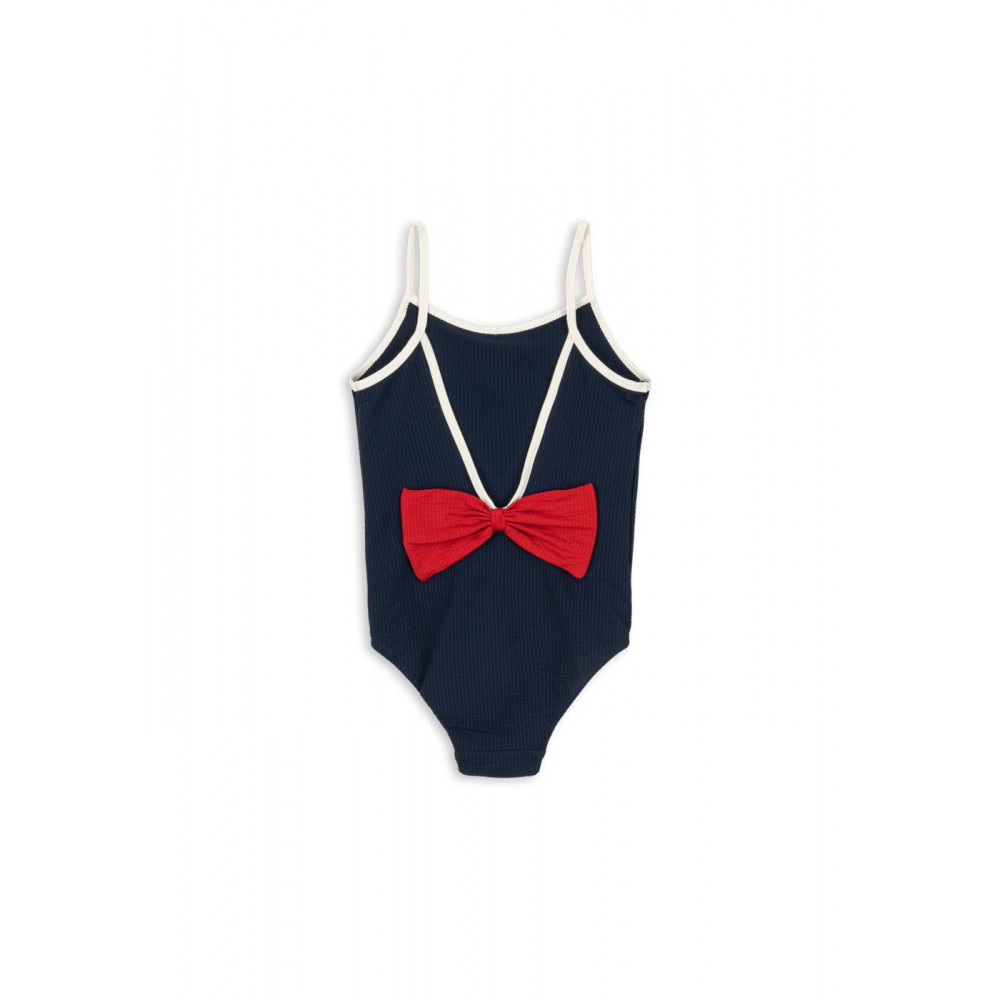 Купальник з м'якої тканини сірсакер з тонкими бретелями та декоративним бантом ззаду. Швидковисихаюча, еластична та зручна для носіння у веселі сонячні дні. Застібки на кнопки розмірів від 6M до 18M.