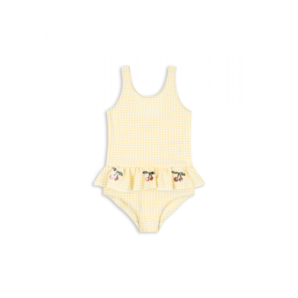 Класичний купальник з текстурованої тканини сірсакер з рюшами та вишневими блискітками. Виготовлений з швидковисихаючої та гнучкої тканини, яка ідеально підходить для довгих днів на пляжі чи в басейні. Застібається на кнопки на штанині розміру 6M-18M.