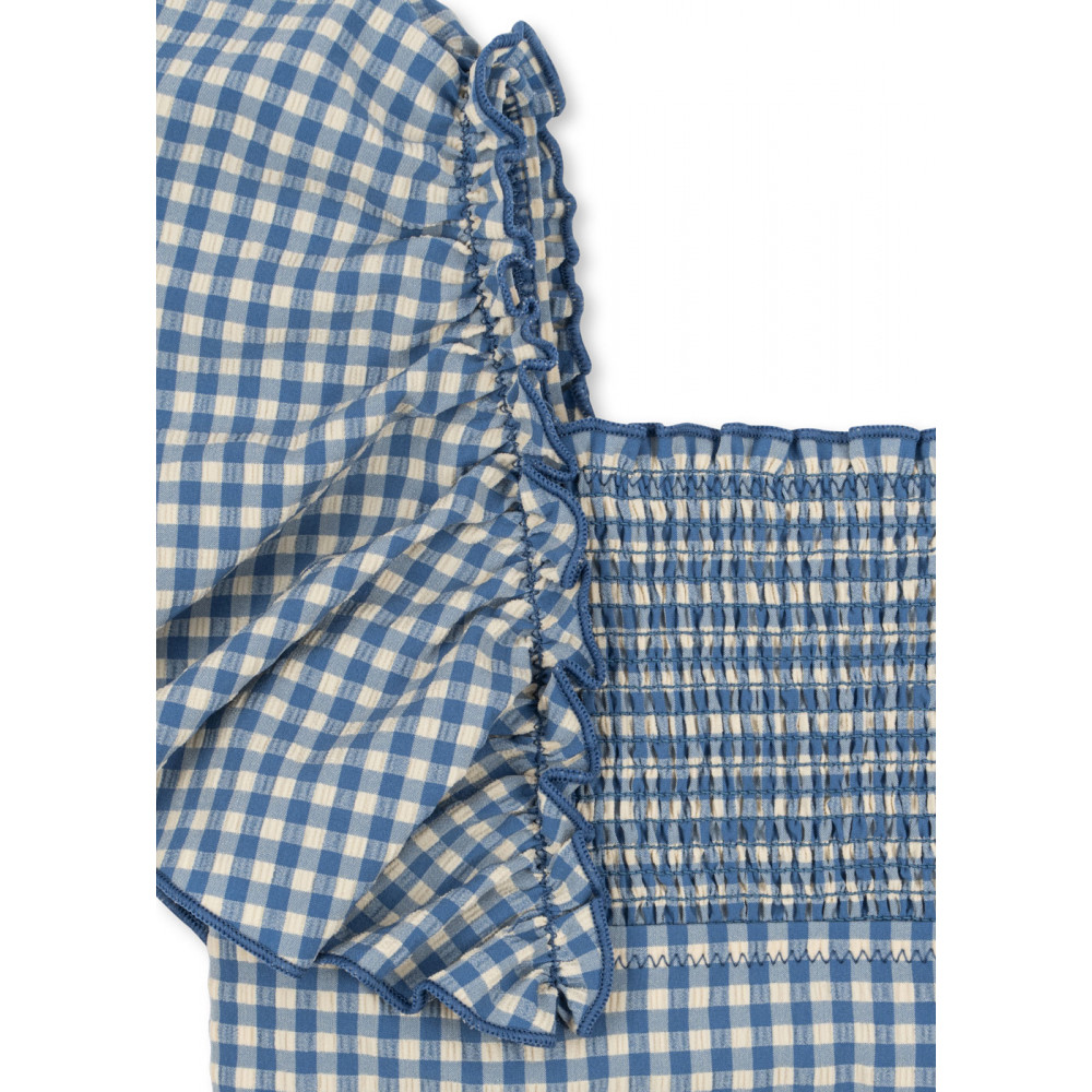 Купальник з еластичної та швидковисихаючої тканини з м'якою тканиною-сірсакером. Модель з квадратним вирізом горловини та декоративним ефектом сорочки.